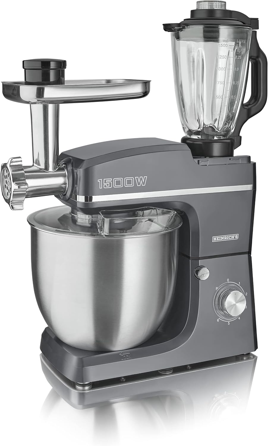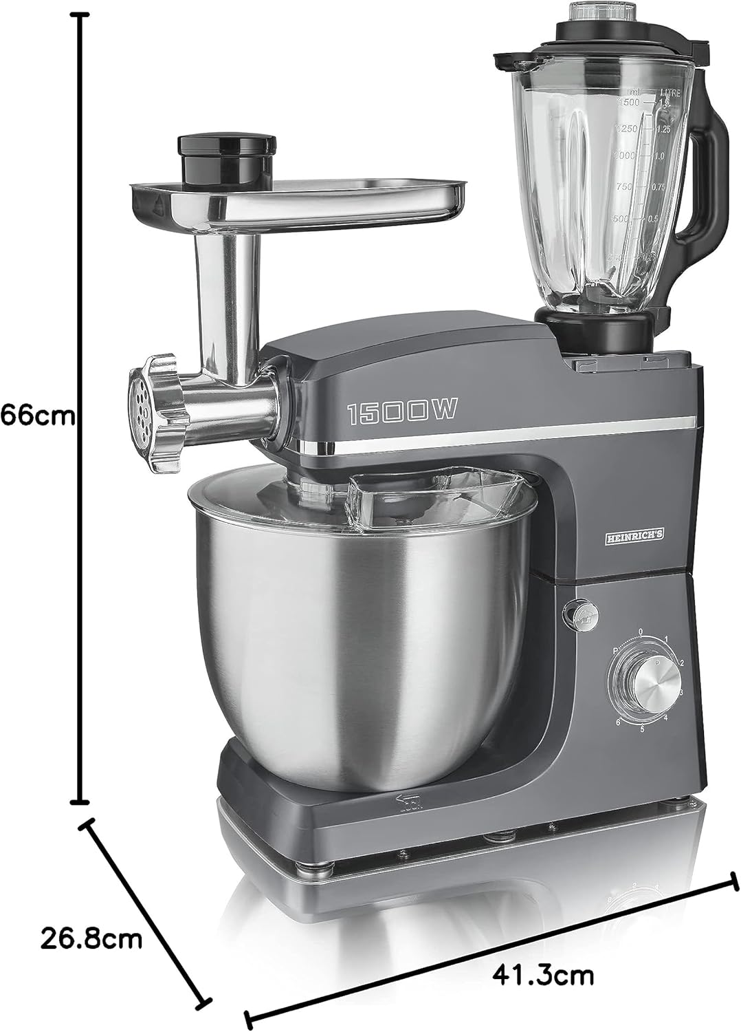 HEINRICHS 3 in 1 Universal Küchenmaschine, Küchengerät 1500W, 6 Geschwindigkeitsstufen, Multifunktionale Knetmaschine mit Fleischwolf, 1.5L Mixerbehälter, XXXL 10L Edelstahlschüssel (Grau)