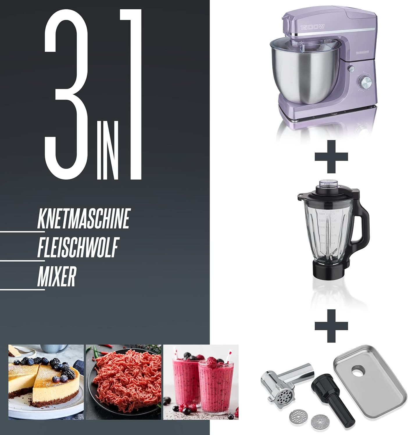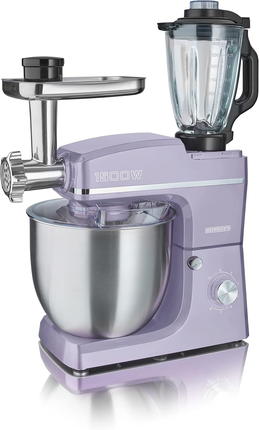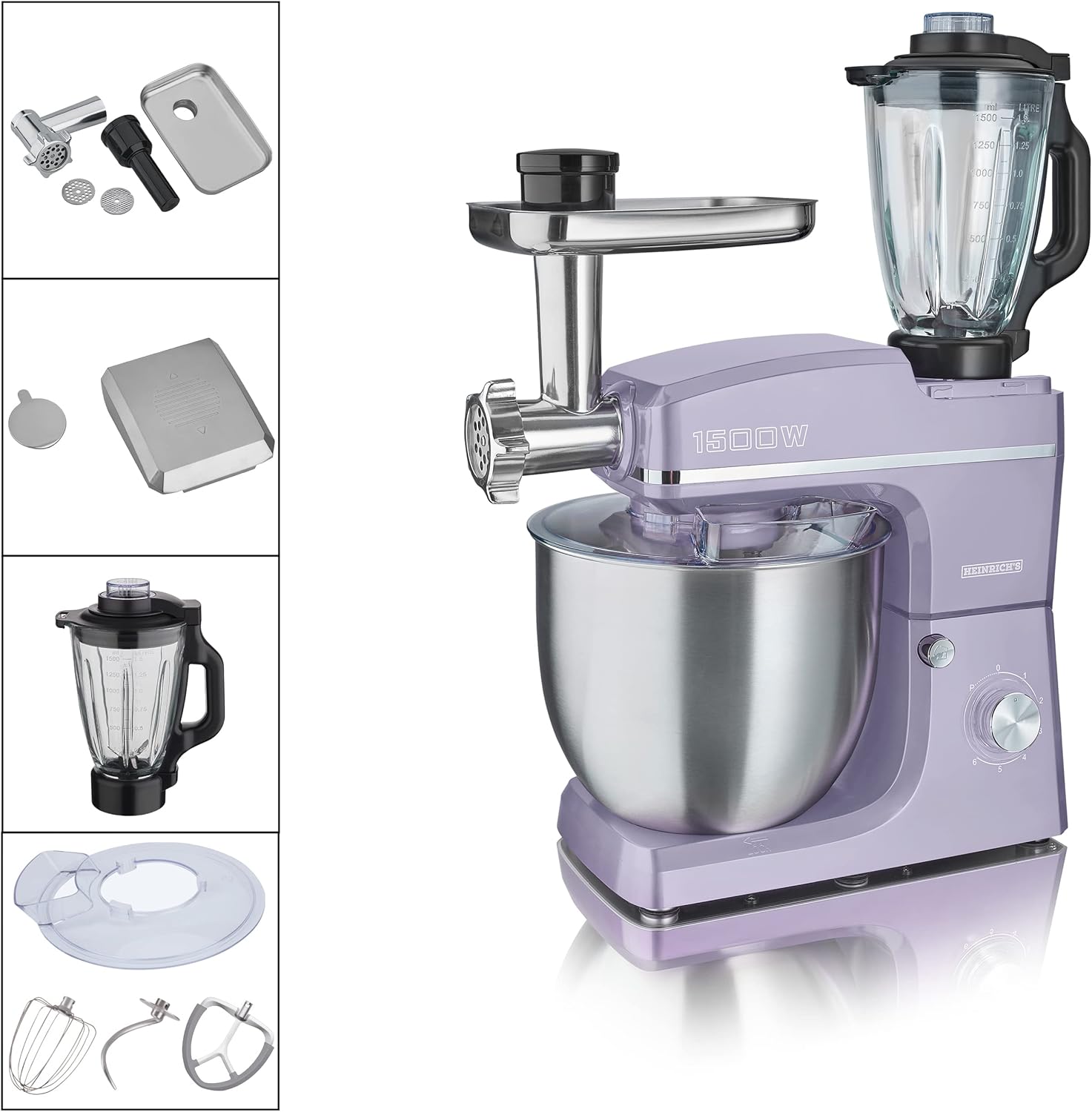 HEINRICHS 3 in 1 Universal Küchenmaschine, Küchengerät 1500W, 6 Geschwindigkeitsstufen, Multifunktionale Knetmaschine mit Fleischwolf, 1.5L Mixerbehälter, XXXL 10L Edelstahlschüssel (Lila)