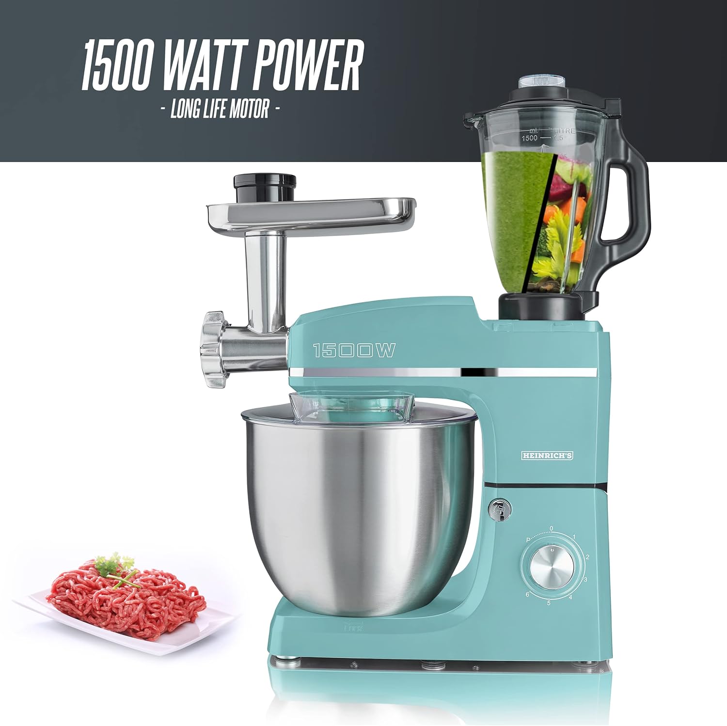 HEINRICHS 3 in 1 Universal Küchenmaschine, Küchengerät 1500W, 6 Geschwindigkeitsstufen, Multifunktionale Knetmaschine mit Fleischwolf, 1,5L Mixbehälter, XXXL 10L Edelstahlschüssel (Grün) LEBENSMITTELMIXER Heinrichs Grün | قیمت یورویی : 149.9€