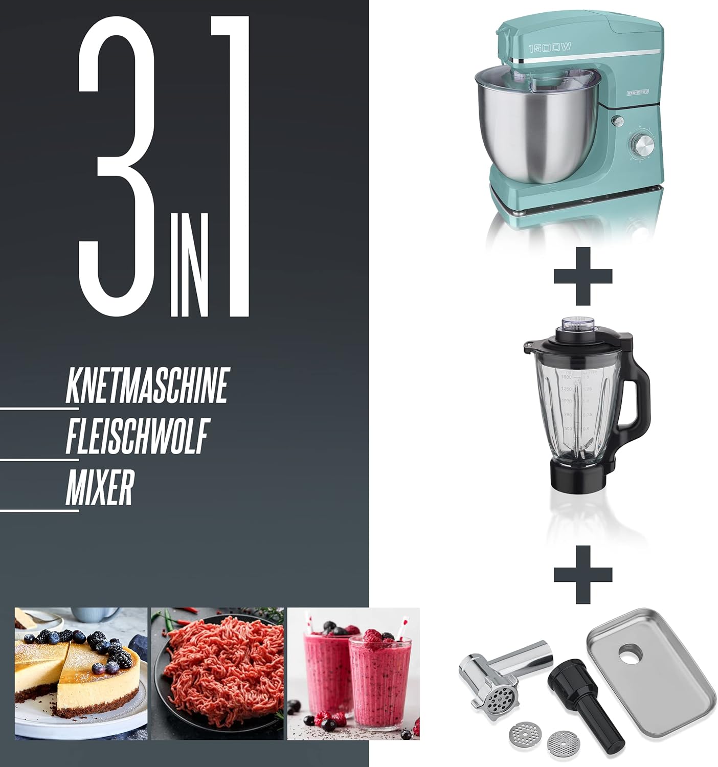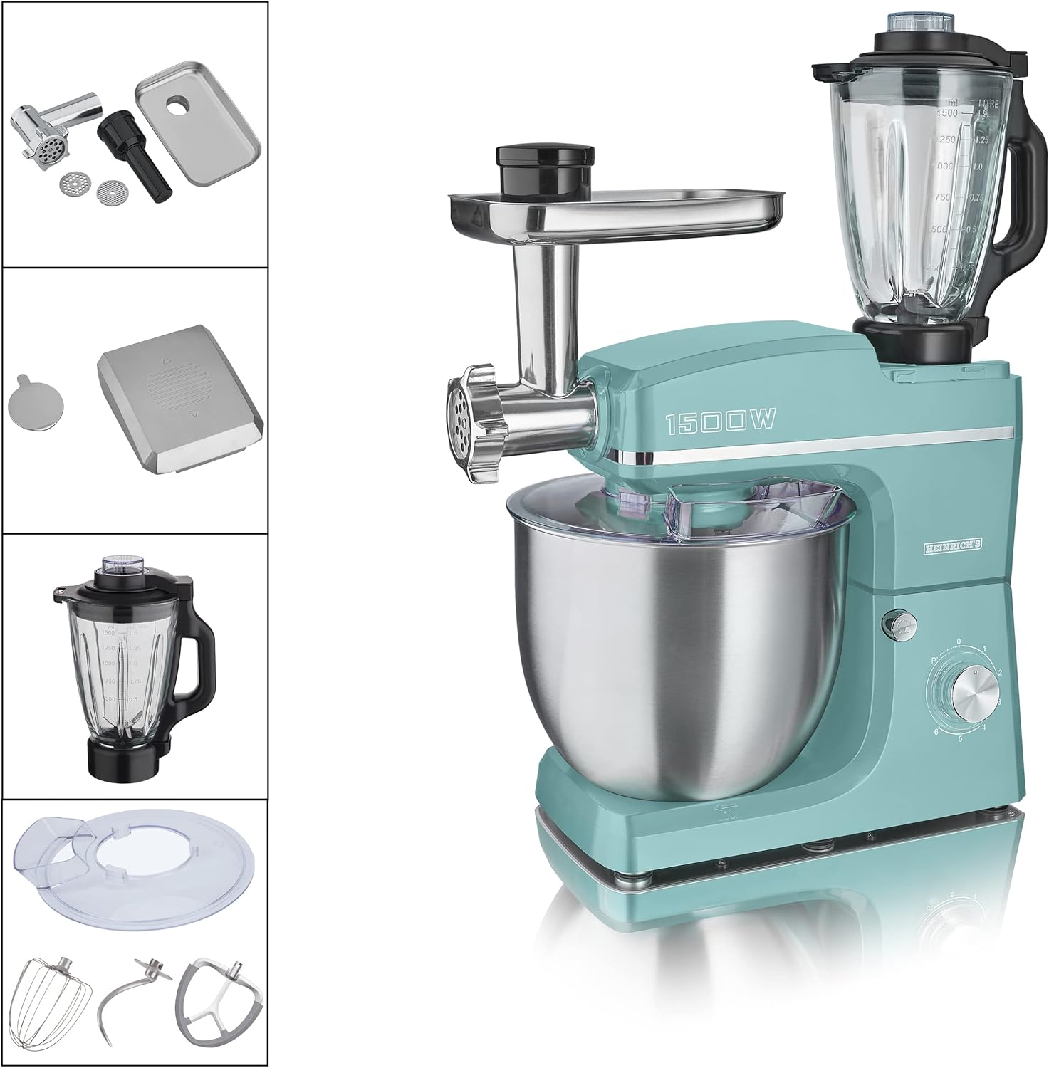HEINRICHS 3 in 1 Universal Küchenmaschine, Küchengerät 1500W, 6 Geschwindigkeitsstufen, Multifunktionale Knetmaschine mit Fleischwolf, 1.5L Mixerbehälter, XXXL 10L Edelstahlschüssel (Grün) | قیمت یورویی 149.9€