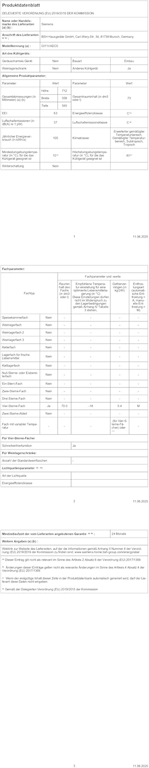 Siemens GI11VADC0 iQ500 Einbau-Gefrierschrank / A+++ / 95 kWh/Jahr / 70 l / lowFrost / freshSense / softClosing Tür EEK C 72x56 cm | قیمت یورویی 685.55€