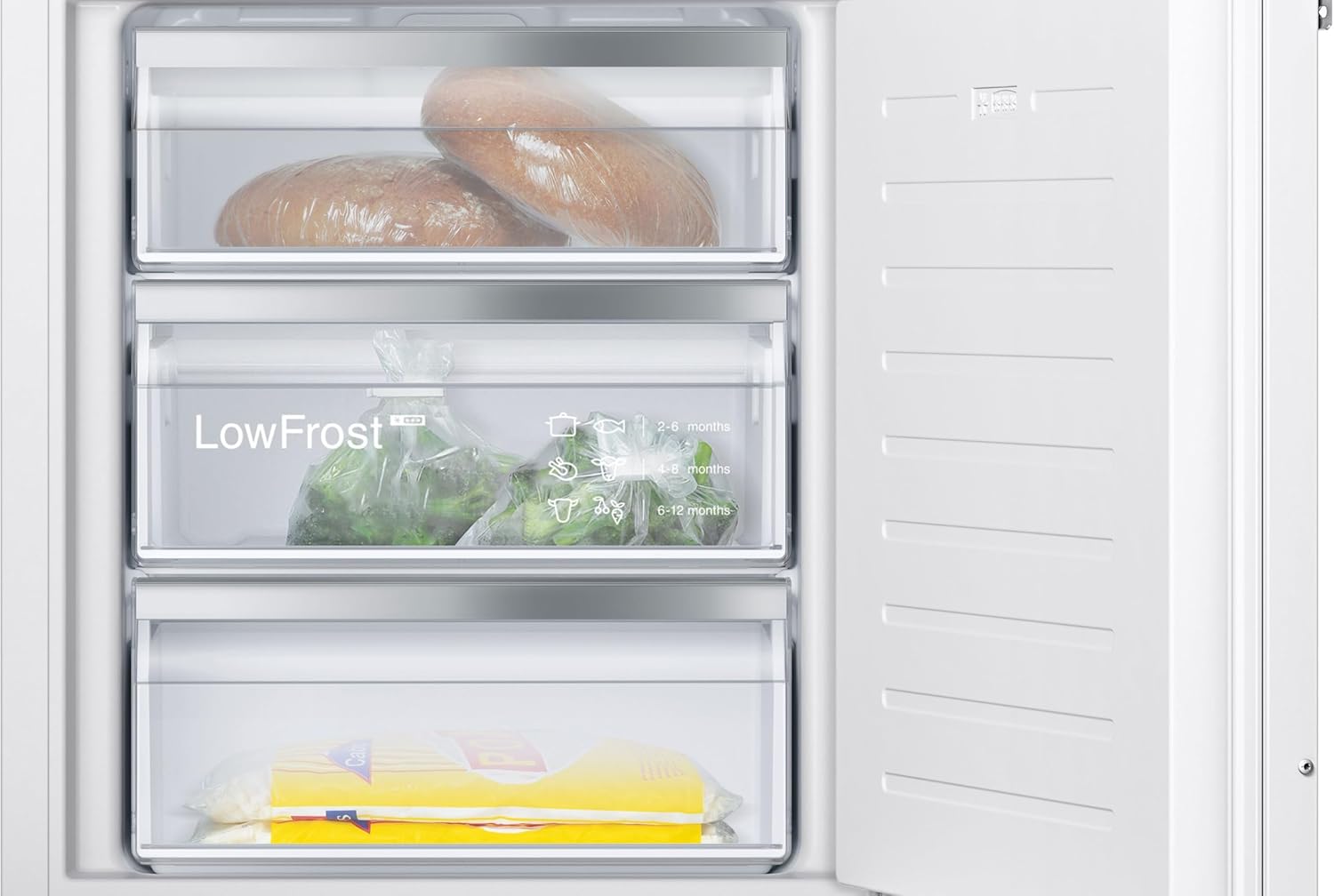 lowFrost: Weniger und einfacher abtauen dank lowFrost: Die Technologie dieses integrierten Tiefkühlschranks reduziert Eisbildung und ist gleichzeitig energieeffizient. softClosing-Tür: Mit einer softClosing-Tür ist Ihr Gefrierschrank stets ordnungsgemäß und vollständig geschlossen. Außerdem ist eine Türdämpfung in allen Flachscharnieren integriert. freshSense: Sensoren im Einbau-Gefrierschrank sorgen für eine konstante Innentemperatur und deutlich länger frische Lebensmittel. superFreezing: Senken Sie die Temperatur Ihres integrierbaren Gefrierschranks temporär, um hinzukommende Lebensmittel schnell herunterzukühlen – für eine stabile Innentemperatur. weitere Austattungsmerkmale: Energieeffizienzklasse C, Nutzinhalt 70 Liter, Elektronische Temperaturregelung über LED ablesbar, Akustischer Alarm, Optische Warnanzeige. | قیمت یورویی : 685.55€