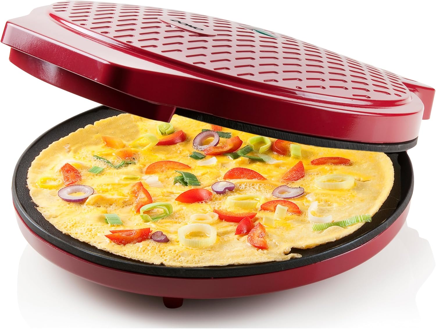 Vielseitiges Küchengerät: Ideal für frische Pizza, Tiefkühlpizza, Omelett, Pfannkuchen, Quiche,Tortilla, Lassen Sie das Gerät offen und Sie können die untere Platte als Backblech verwenden Bereiten Sie eine Pizza in 12 min. zu Durchmesser: 30 cm Hochwertige Antihaftbeschichtung 2 Heizelemente für eine gute Hitzeverteilung Kontrollleuchte für An-/Aus und Betriebsbereitschaft einfache Benutzung, einfache Reinigung inkl. Rezeptheft 230 V - 50 Hz - 1450 W | قیمت یورویی : 47.11€