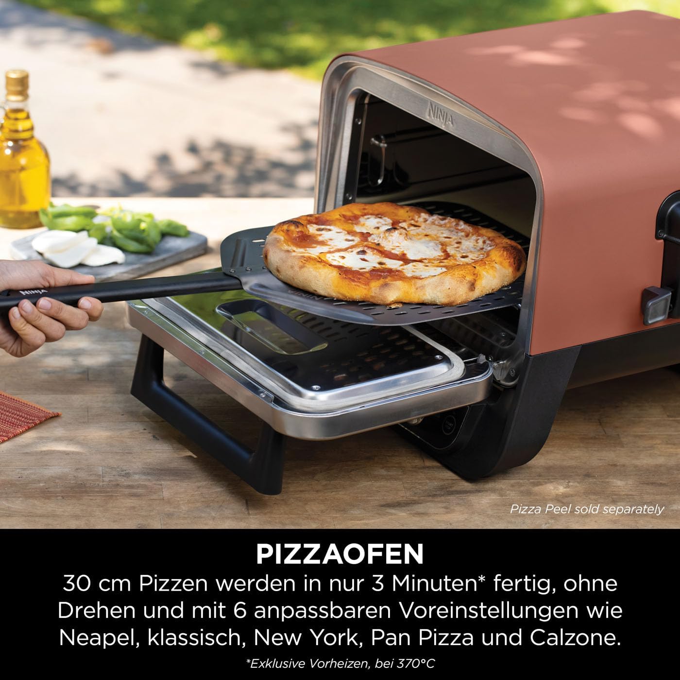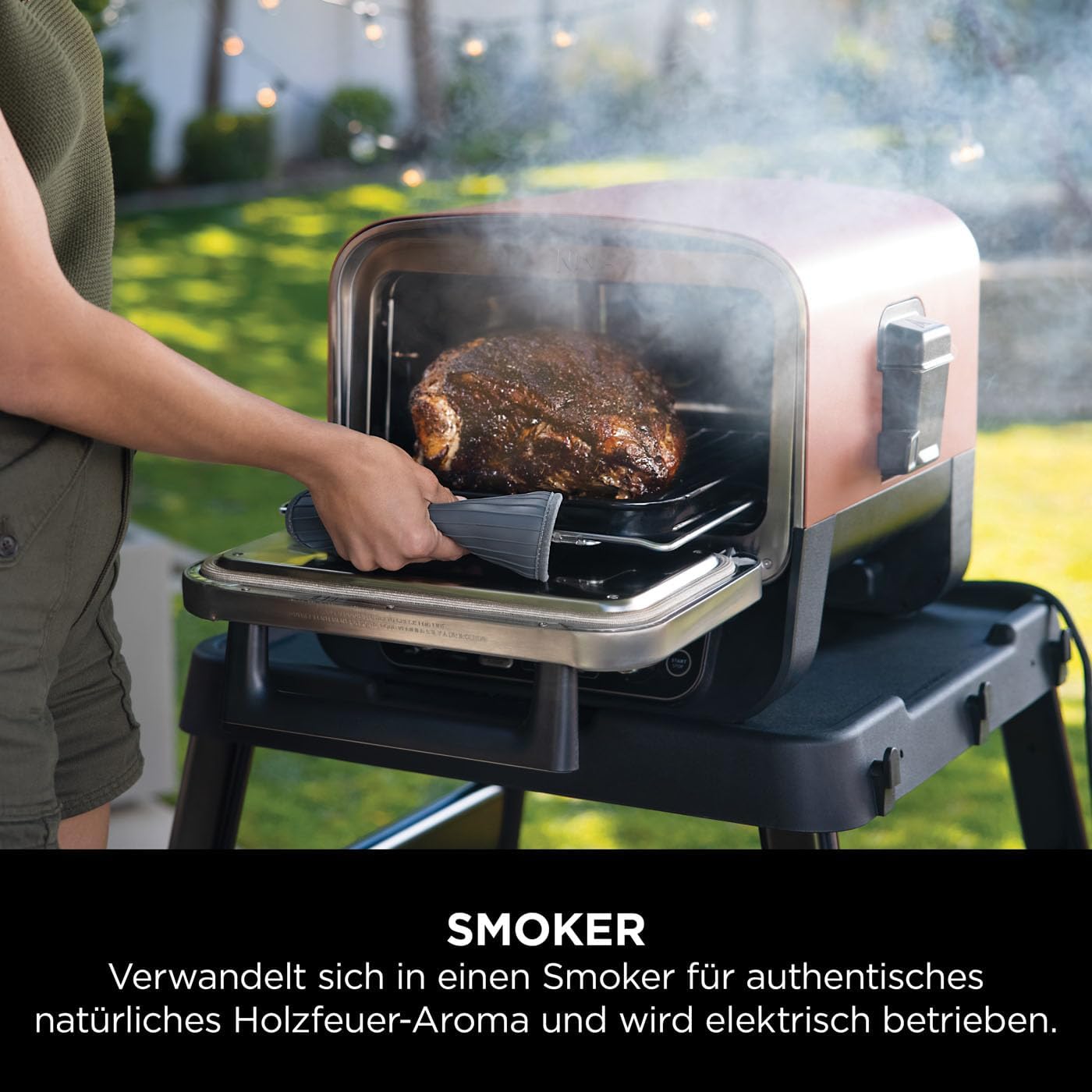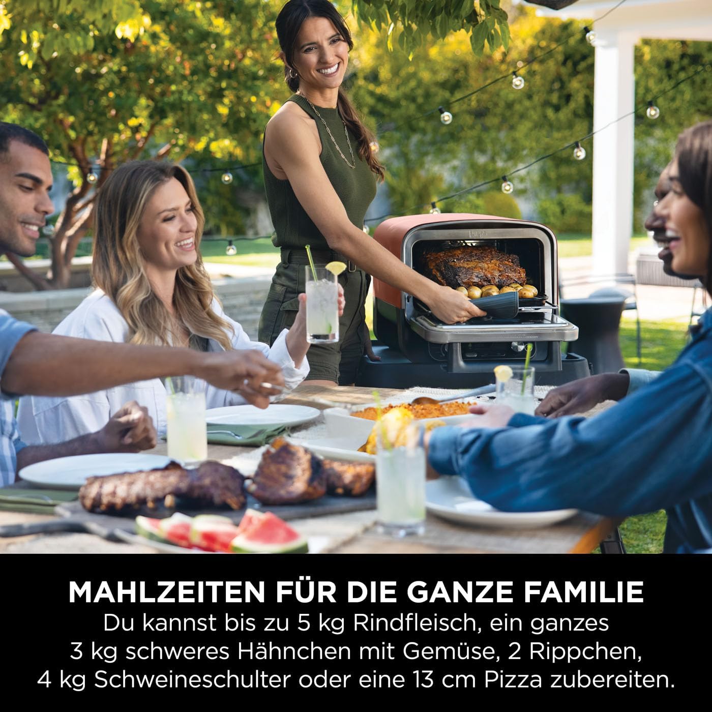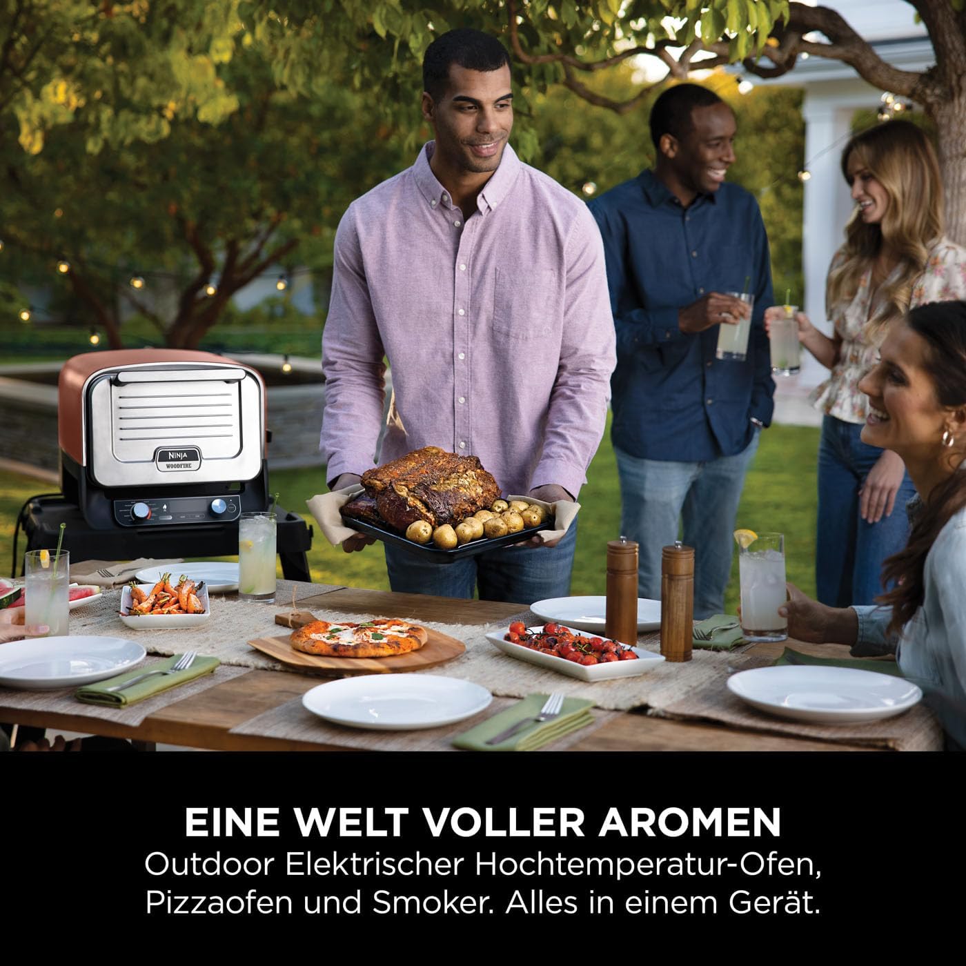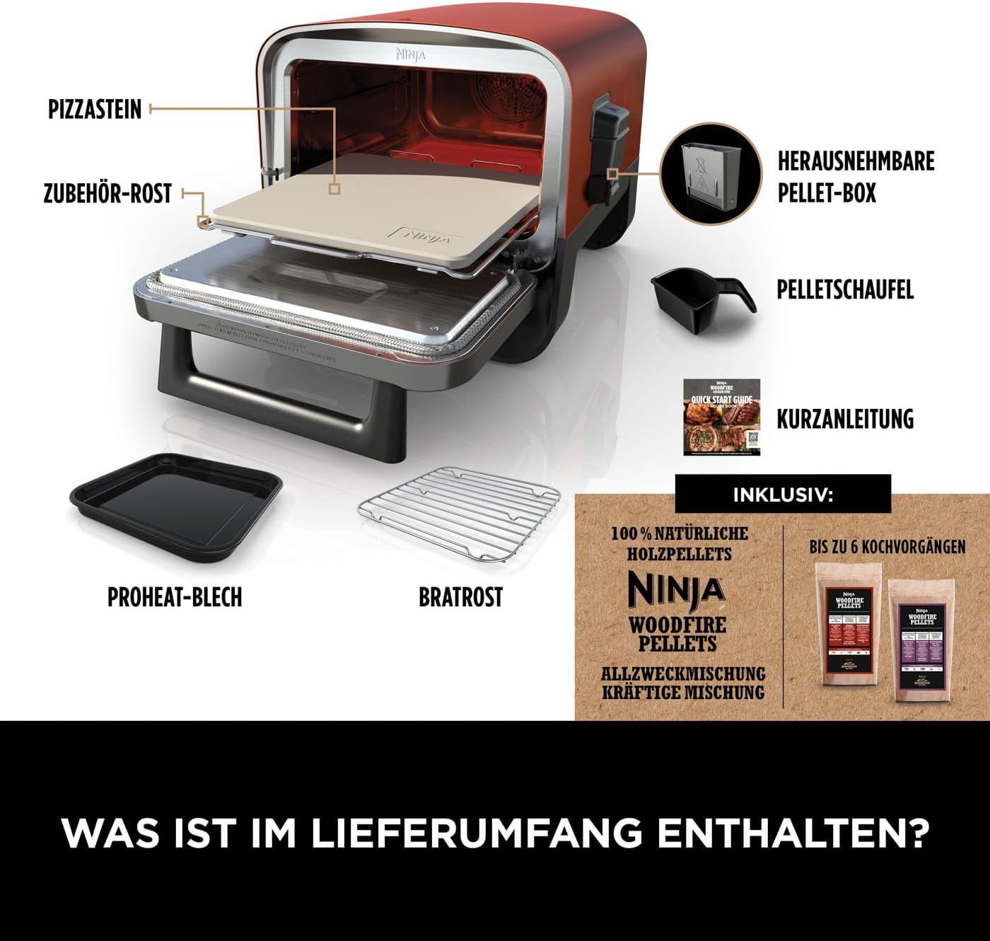 Ninja Woodfire Outdoor-Ofen, 8-in-1-Pizza- Ofen, BBQ-Smoker mit Bratrost, Pro-Heat-Schale, Pizzastein, Holzpellets & Schaufel, elektrisch, 6 Pizza-Einstellungen, Burnt Orange OO101EU 8-in-1 Pizzaofen | قیمت یورویی 264.7€