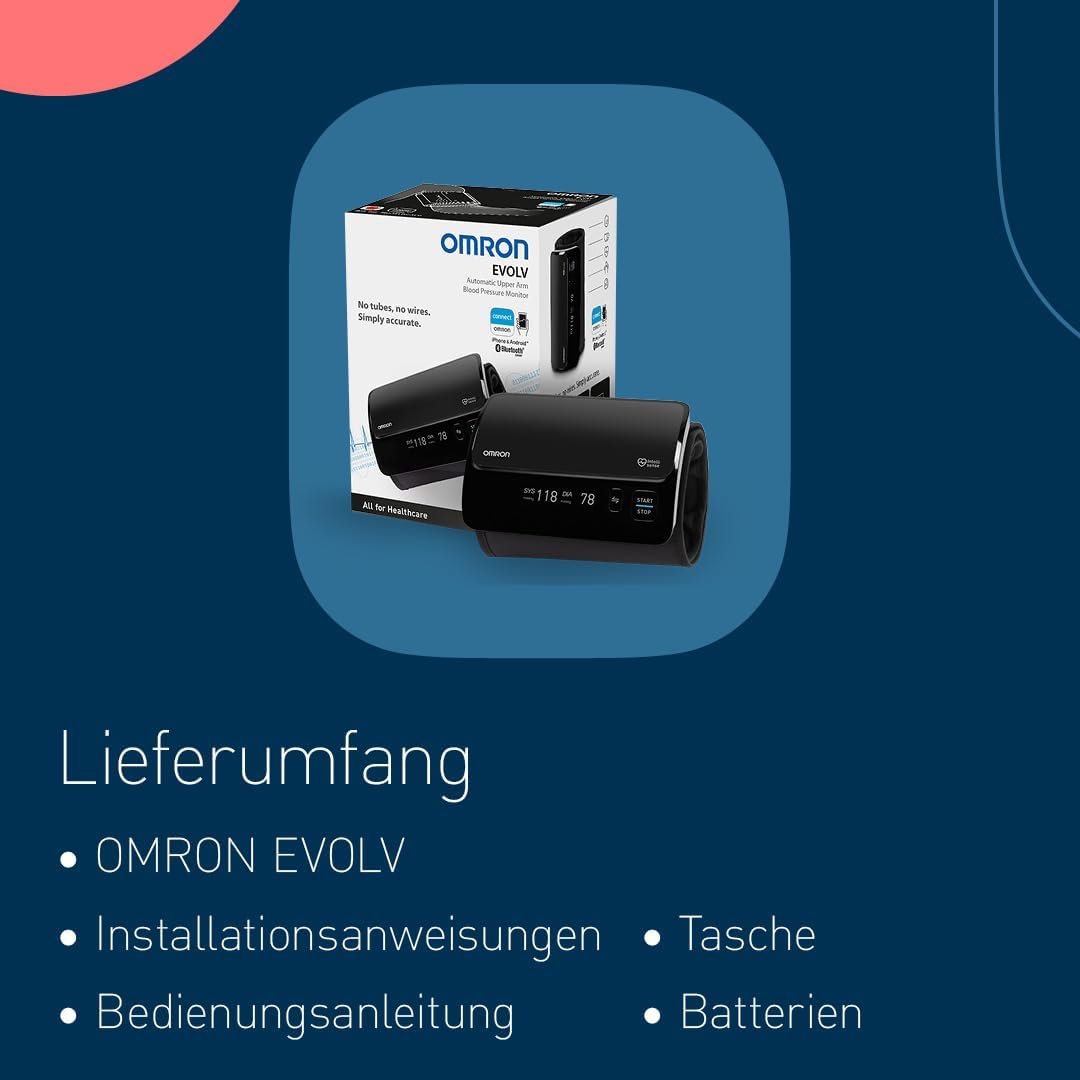 OMRON EVOLV Automatisches Oberarm-Blutdruckmessgerät ohne Kabel, klinisch validiert, auch für Schwangere, mit kostenloser Gesundheits-App, AKTION: Jetzt 6 Monate OMRON connect Premium gratis | قیمت یورویی 109.99€