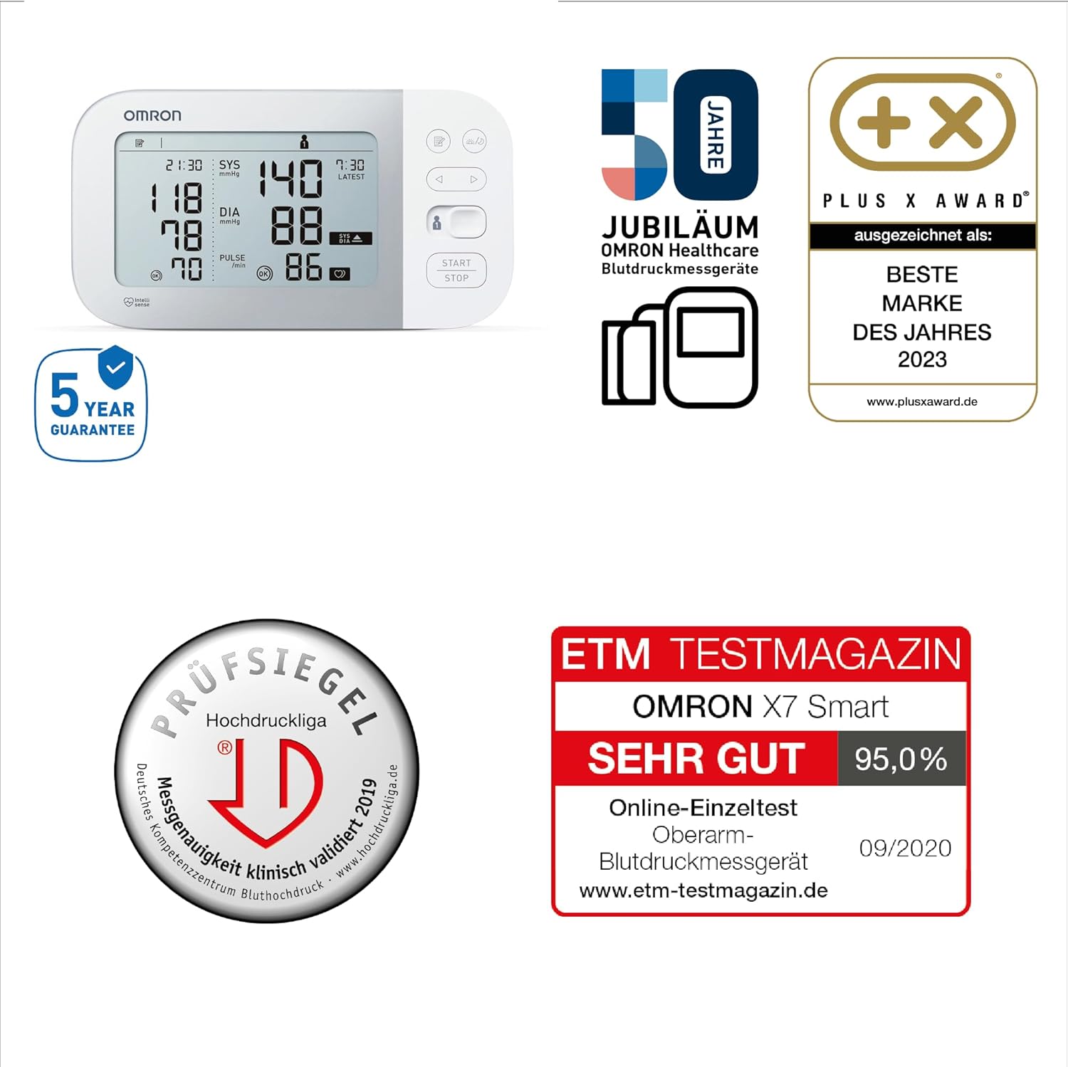 EIN QUALITATIV HOCHWERTIGES MEDIZINPRODUKT, AUF DAS SIE SICH VERLASSEN KÖNNEN. Klinisch validiert; Die Messgenauigkeit wurde durch unabhängige Organisationen bestätigt. Das OMRON X7 Smart verfügt zudem über eine spezielle klinische Validierung für Diabetiker und Schwangere (Präeklampsia). Auch die Deutsche Hochdruckliga e.V. hat die Messgenauigkeit durch Vergabe des Prüfsiegels bestätigt: JETZT MIT ERWEITERTER GARANTIE VON 5 JAHREN FÜR MEHR SICHERHEIT: Das OMRON X7 Smart Messgerät weist auf potenzielles Vorhofflimmern (AFib) hin, welches oft unentdeckt bleibt, aber die Schlaganfall- und Emboliegefahr erhöhen kann 3-FACH MESSUNG: im AFib (Vorhofflimmern)-Modus nimmt das Gerät drei Messungen in Folge vor und ermittelt den Durchschnittswert, um den Blutdruck am Morgen und Abend im zeitlichen Verlauf zu bestimmen. FÜR DEN HAUSGEBRAUCH: Die vorgeformte OMRON Intelli Wrap Manschette (22-42cm) lässt sich problemlos anlegen und erzielt in jeder beliebigen Position um den Oberam genaue Messwerte EINFACHES ANZEIGEN UND SPEICHERN DER MESSWERTE: Die Ergebnisse können auf dem Dual-Display mit vorherigen Messwerten verglichen oder per Bluetooth automatisch an die OMRON connect auf Ihrem Smartphone übermittelt werden - jetzt Premium Funktionen kostenlos 6 Monate testen LIEFERUMFANG: 1 x OMRON X7 Smart Blutdruckmessgerät mit Intelli Wrap Manschette, Batterien, Bedienungsanleitung & Tasche / OMRON connect App für einfachen Zugang zu den Messerwerten herunterladen KOMPATIBEL MIT: HHP-CM01 adapter | قیمت یورویی : 104.5€