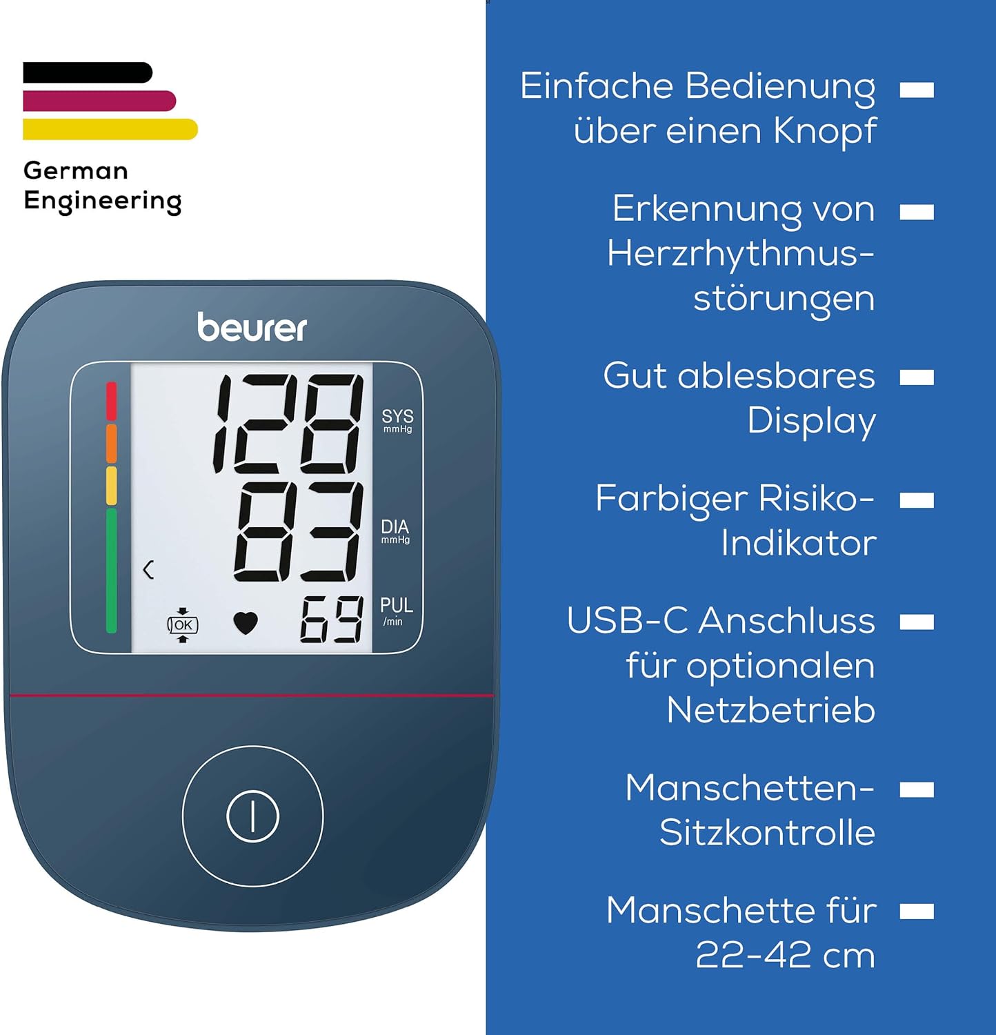Beurer BM 25 Oberarm Blutdruckmessgerät, einfache Bedienung über einen Knopf, genaue Messung durch Manschetten-Sitzkontrolle, Arrhythmie-Erkennung, mit USB-C-Anschluss, Manschette für 22-42 cm | قیمت یورویی 21.99€
