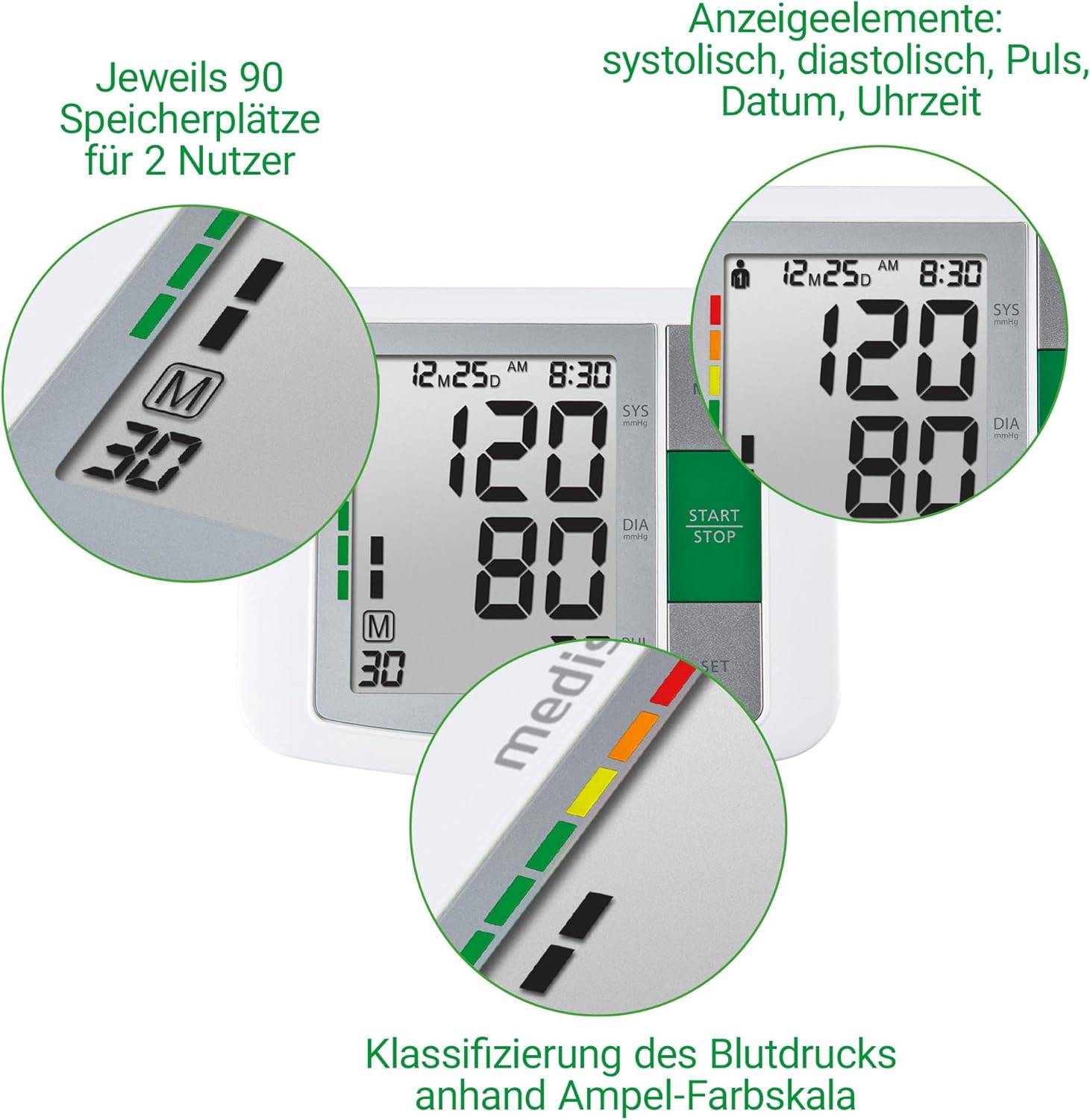 دستگاه پزشکی: برای خودپایشی فشار خون با مقیاس رنگی چراغ راهنمایی برای طبقه‌بندی آسان نتایج اندازه‌گیری. علاوه بر اندازه‌گیری فشار خون واقعی، اندازه‌گیری نبض نیز انجام می‌شود. ضربان قلب نامنظم: BU 510 می‌تواند آریتمی‌های احتمالی نبض را نشان دهد. فقط پزشک شما می‌تواند نوع و شدت آریتمی را ارزیابی کند. عملکرد حافظه: دستگاه فشارسنج بازویی مجهز به حافظه داخلی است که به شما امکان می‌دهد ۹۰ نتیجه اندازه‌گیری را برای هر دو کاربر ذخیره کنید. برای بازو: این کاف برای دور بازوی ۲۲ تا ۳۶ سانتی‌متر مناسب است. دارای صفحه نمایش بزرگی است که مقادیر سیستول، دیاستول و نبض و همچنین تاریخ و زمان را نشان می‌دهد. در خانه یا در حال حرکت: دستگاه فشار خون BU 510 با یک کیف نگهداری کاربردی اضافی برای حمل و نقل آسان و ایمن ارائه می‌شود.