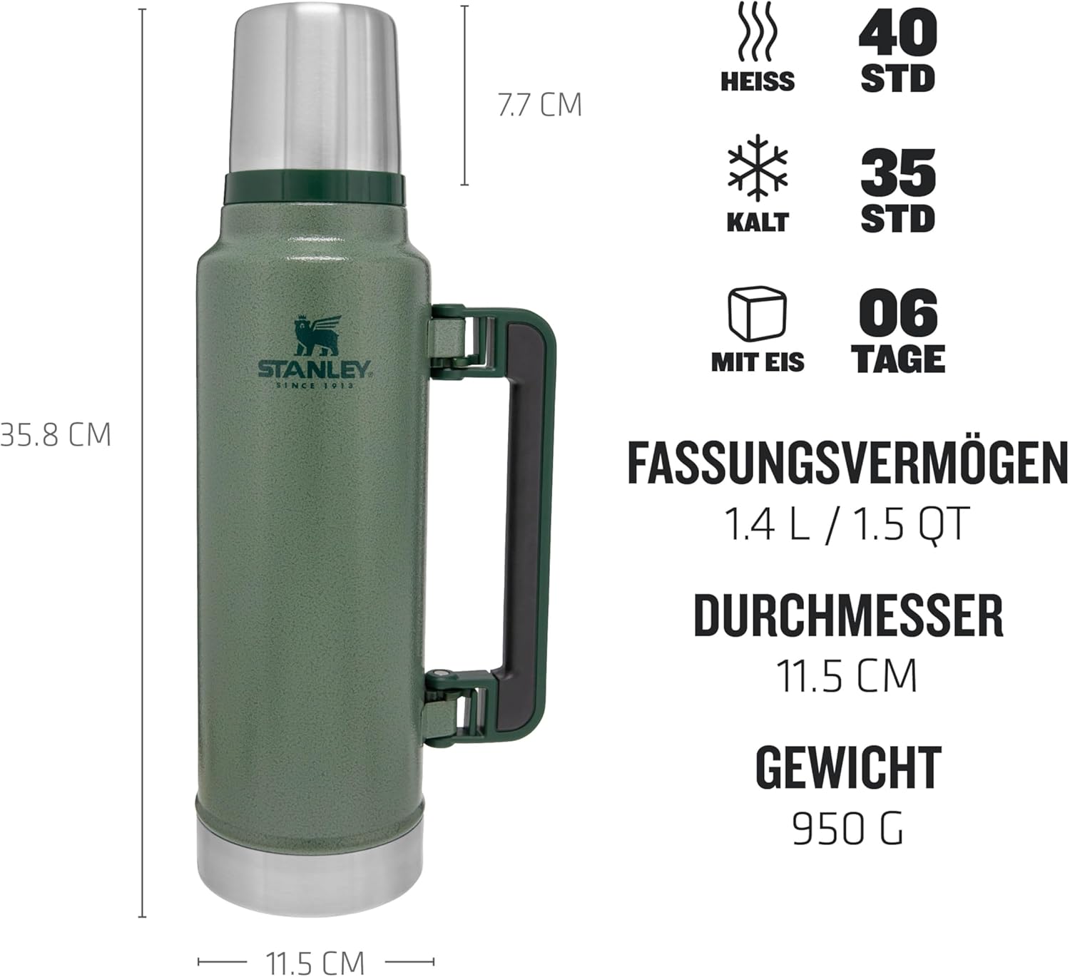 Stanley Classic Legendary Thermosflasche 1.4L - Thermos Hält 40 Stunden Heiß Oder Kalt - Edelstahl Thermoskanne - BPA-Frei - Spülmaschinenfest - Hammertone Green 1400 ml Hammertone Green | قیمت یورویی 50.24€