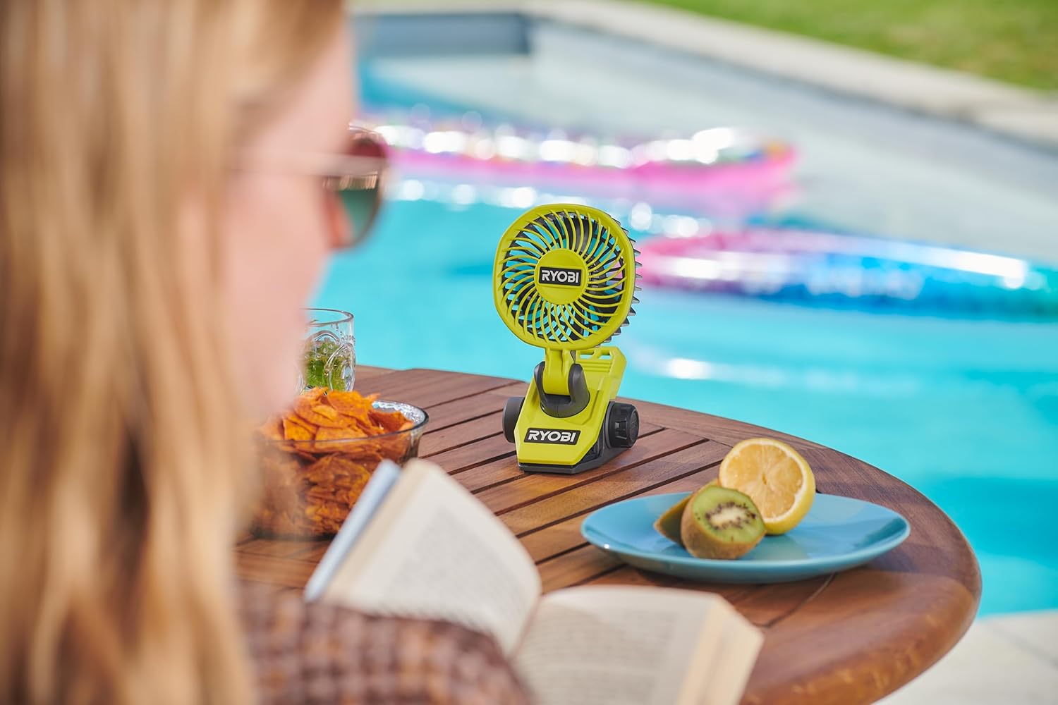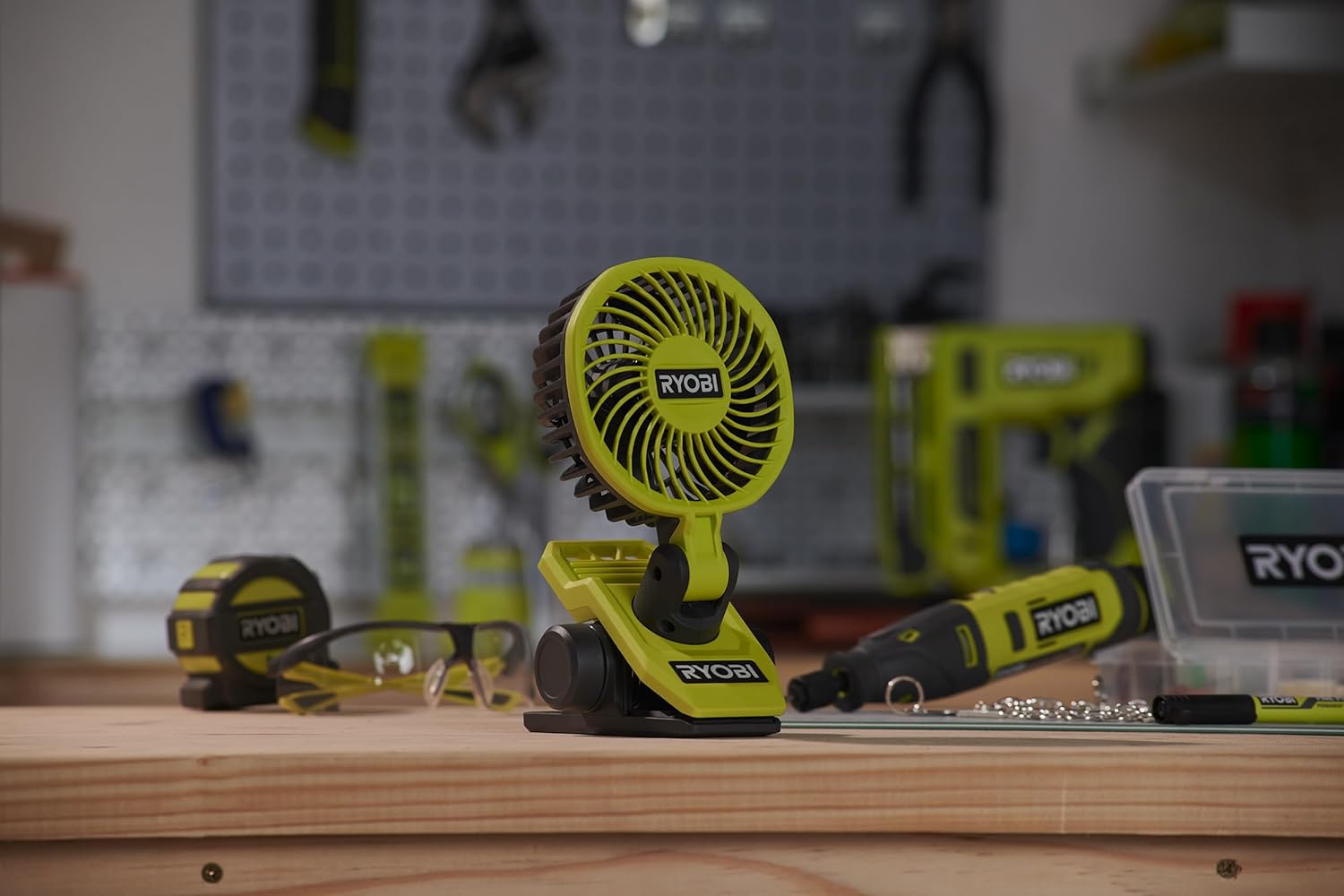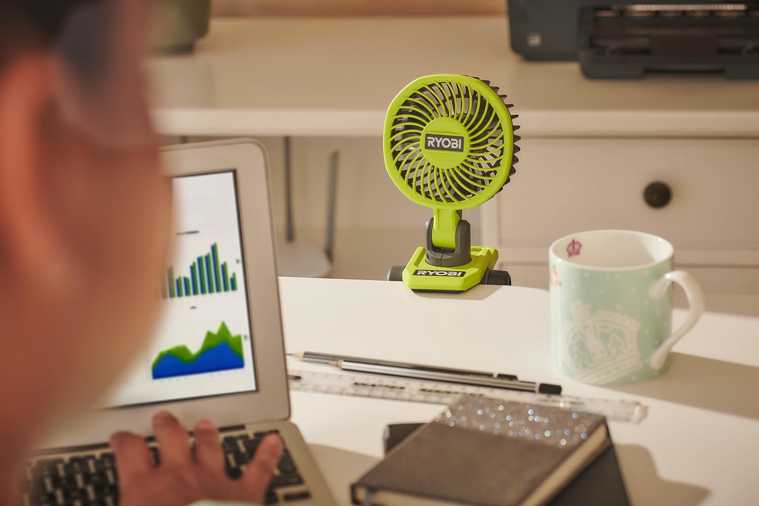 RYOBI 4 V USB-LITHIUM Akku-Clip-Ventilator RCF4-120G, 325°C drehbarer und um 180°C schwenkbarer Kopf, inkl. 1 x 4 V 2,0 Ah Akku und USB-C Ladekabel | قیمت یورویی 54.99€
