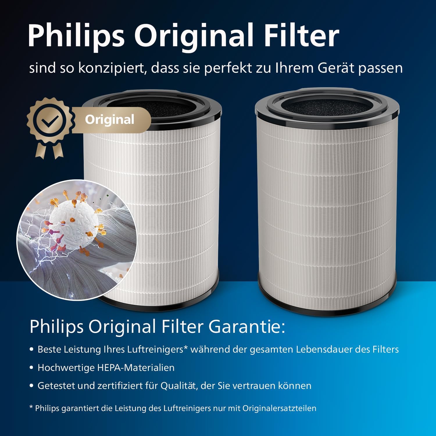 Der Original Philips Filter, um die beste Leistung Ihres Luftreinigers zu gewährleisten. Er wurde zusammen mit dem Gerät selbst entwickelt, um eine perfekte Passform zu gewährleisten, die einen dauerhaft reibungslosen Betrieb garantiert Bis zu 99,9 % Virenentfernung. Der Luftreiniger fängt Aerosole auf, einschließlich solcher, die Atemwegsviren enthalten können. Unabhängig getestet, um bis zu 99,9 % der Viren und Aerosole aus der Luft zu entfernen¹ Der zylindrische 3-in-1-Filter kombiniert alle drei Filterschichten, die für eine optimale Filterleistung Ihres Geräts erforderlich sind. Aktivkohle-, HEPA- und Vorfilter sind die optimale Kombination, um Schadstoffe, Pollen, Viren, Allergene und Bakterien zu entfernen Die NanoProtect HEPA-Technologie fängt nicht nur Schadstoffe ein, sondern nutzt eine spezielle elektrostatische Ladung, um sie anzuziehen. Dadurch reinigt sie die Luft schneller als der medizinisch genutzte HEPA H13-Filter² Der integrierte 3-in-1-Filter von Philips bietet konstanten Schutz und garantiert eine optimale Filterung für bis zu 36 Monate³ | قیمت یورویی : 97.99€