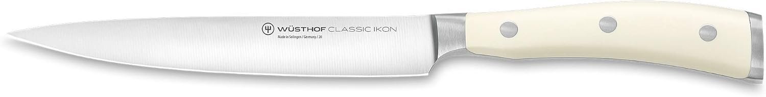 Mit den cremeweißen Griffen sind Wüsthof Messer der Classic Ikon Crème Serie ein eleganter Eyecatcher in der Küche. Dabei sorgt die anspruchsvolle Solinger Qualität bei der Anwendung für einen weiteren Wow-Effekt – richtig gute Kochmesser, zeitloses Design Die biegsame Klinge (16cm) kann ideal an kleinen Knochen, Gräten oder Haut entlanggeführt werden und eignet sich zum filigranen Schneiden und zum hauchdünnen Filetieren – für exakte Schnitte bei Fleisch, Fisch oder Obst, wie feine Orangen-Filets Das ideal ausbalancierte Profi-Messer aus Edelstahl wird im speziellen Schärfverfahren geschliffen, bevor die Messerklinge per Hand den finalen Polierabzug erhält und somit ihre beeindruckende Schärfe – für langanhaltende Präzision Durch die kleine Wölbung im vorderen Bereich liegt der ergonomische Griff besonders angenehm und sicher in der Hand. Die hellen, pflegeleichten Griffschalen sorgen für einwandfreie Hygiene und sehen auch in weißen Küchen richtig gut aus Classic Ikon Creme gehört zum Lieblings-Küchenzubehör der stilbewussten Köchin, das gute Wüsthof Fleischmesser beeindruckt zudem als offizielles Werkzeug der deutschen Nationalmannschaft der Köche. Qualitätsmesser – Made in Germany, geschmiedet in Solingen | قیمت یورویی : 119€