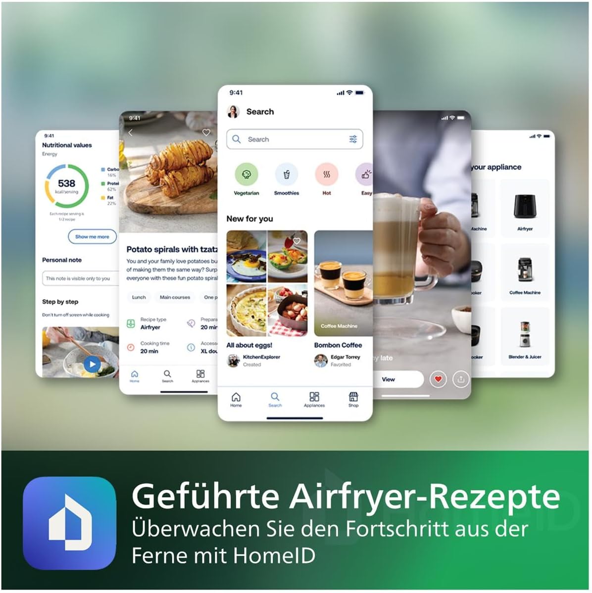 16-in-1-Kochfunktionen: Der Philips Airfryer hat 16 Kochfunktionen, wie z. B. Braten, Backen, Rösten, Grillen, Auftauen, Gären. Für leckere, nahrhafte Mahlzeiten mit bis zu 90 % weniger Fett.* Fernkochen: Verbinden Sie Ihren Airfryer mit der HomeID-App und finden Sie Hunderte von personalisierten Rezepten.** Über die WLAN-Verbindung können Sie den Kochvorgang auf Ihrem Telefon überwachen. Großer Airfryer: 7,2-Liter-Behälter & 1,4 kg fassender Korb für alles von Pommes frites & Hähnchenkeulen bis hin zu Kuchen & gegrilltem Gemüse - 7 voreingestellte Garprogramme mit Touchscreen-Display. Außen knusprig, innen zart: Die Rapid Air Technology mit ihrem einzigartigen "Seestern"-Design verwirbelt optimale Heißluft für köstliche, saftige und knusprige Speisen. Einfach zu benutzen und zu reinigen: Spülmaschinenfeste Teile und ein antihaftbeschichteter QuickClean-Korb sorgen für eine mühelose Reinigung, während das Luftfrittieren den Frittiergeruch eliminiert. Mehr als nur gesundes Frittieren mit der HomeID App-Konnektivität. Servieren Sie mit dem XXL-Inhalt unterschiedliche Mahlzeiten für die ganze Familie - einfach und mit bis zu 90 %* weniger Fett. | قیمت یورویی : 144€