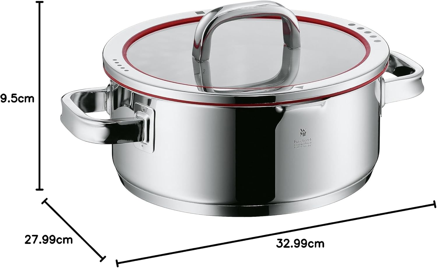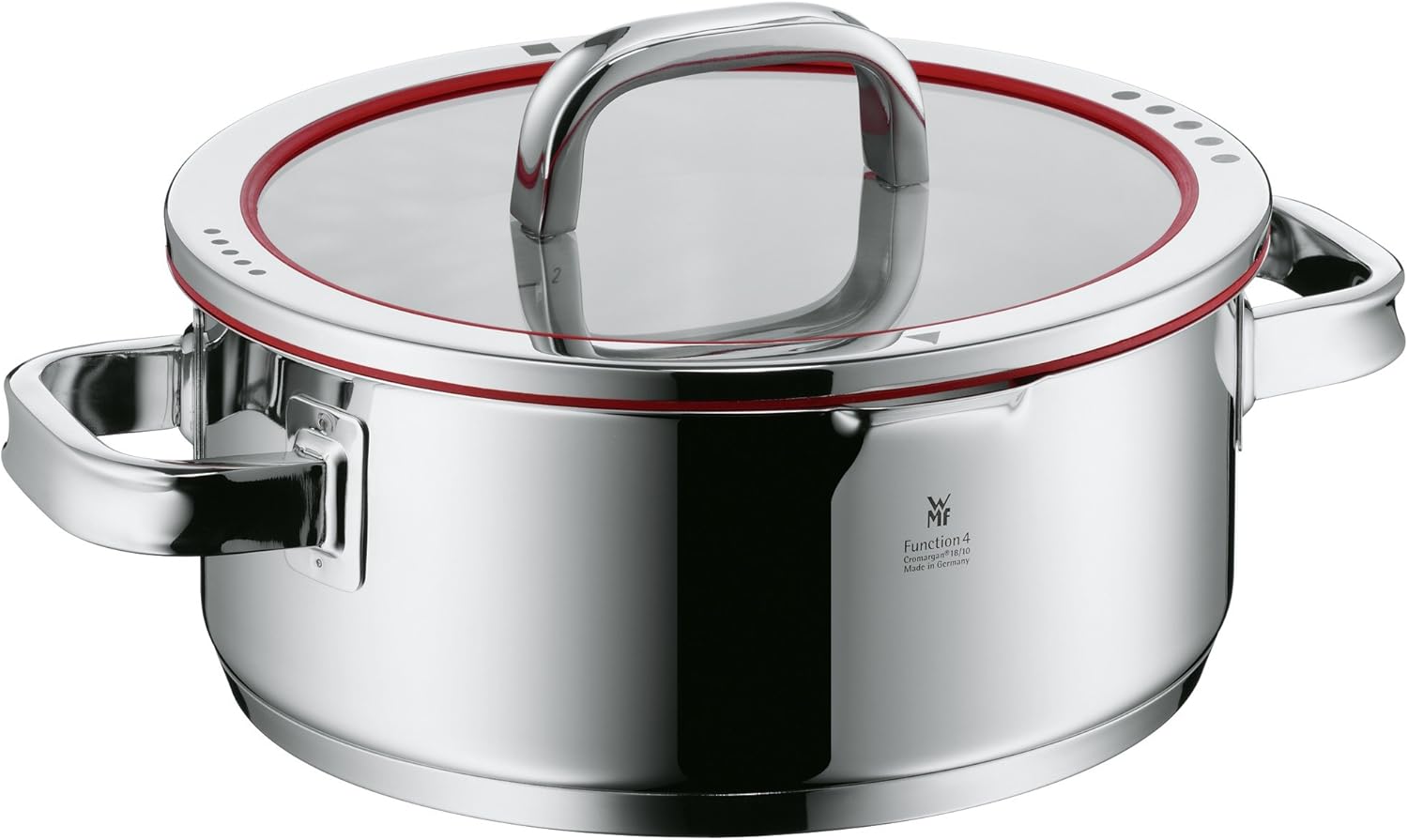 WMF Function 4 Kochtopf groß 24cm, Glasdeckel, Bratentopf Induktion 4,1l, Cromargan Edelstahl poliert, 4 Abgießfunktionen, Innenskalierung, rot Function – Bratentopf 24 cm | قیمت یورویی 109.99€