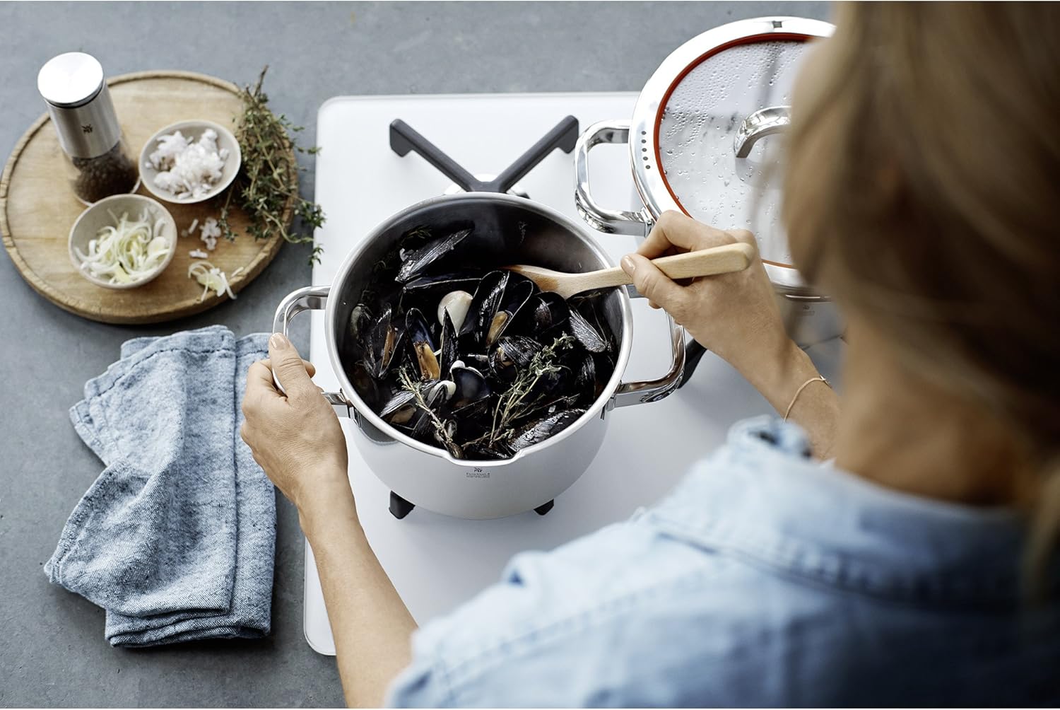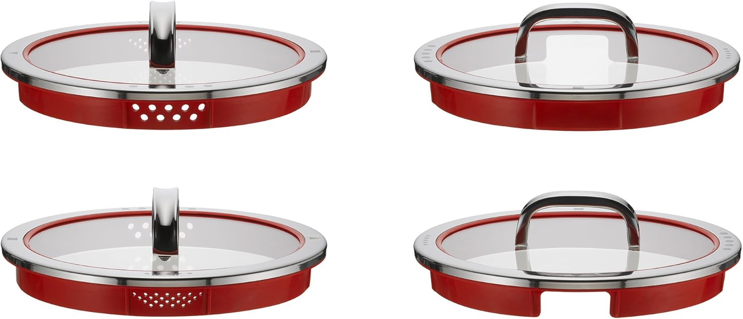 قابلمه بزرگ WMF مدل Function 4، سایز 24 سانتیمتر، درب شیشهای، سازگار با دستگاههای القایی، حجم 4.1 لیتر، جنس استیل ضد زنگ Cromargan براق، 4 عملکرد ریختن مواد، مقیاس اندازهگیری داخلی، عملکرد قرمز – قابلمه 24 سانتیمتری