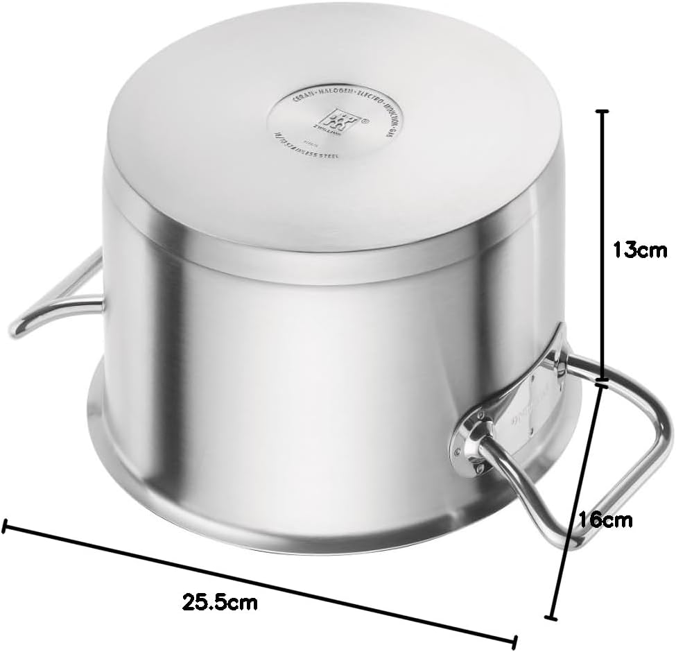 قابلمه zwilling Pro Induktion Fleischtopf از استیل ضد زنگ 18/10 با قطر 16 سانتیمتر و ظرفیت 2 لیتر ساخته شده است. مناسب برای انواع اجاقها از جمله القایی، دارای پایه چندلایه برای توزیع یکنواخت حرارت و دستههای ارگونومیک.