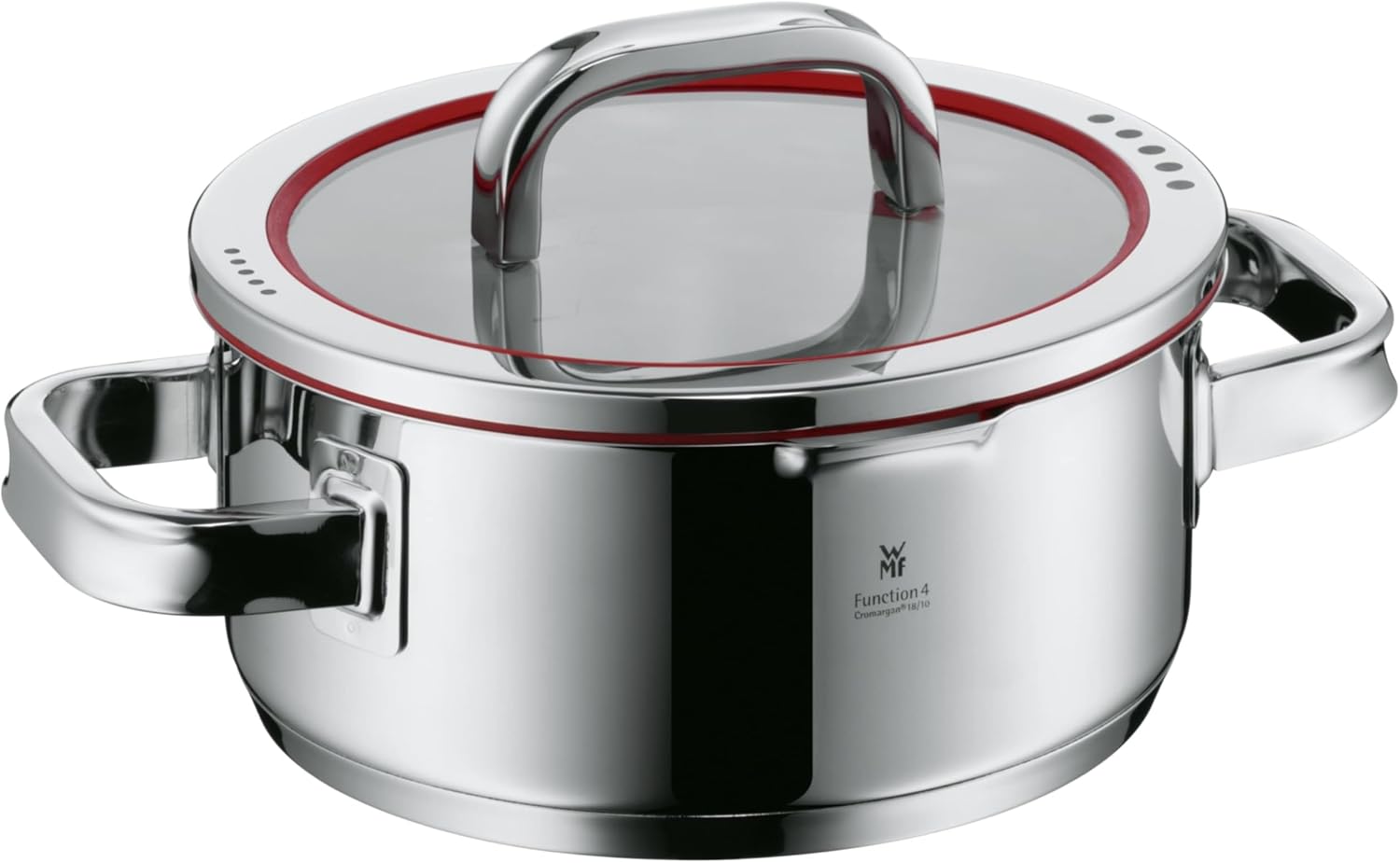 WMF Function 4 Kochtopf klein 20cm, Glasdeckel, Bratentopf Induktion 2,5l, Cromargan Edelstahl poliert, 4 Abgießfunktionen, Innenskalierung, rot Function – Bratentopf 20 cm | قیمت یورویی 99.99€