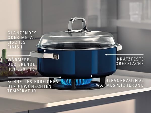 Inhalt: Schmortopf (28 cm) mit Glasdeckel. Spülmaschinengeeigneter Topf Fusiontec: 20 natürliche Mineralien, untrennbar miteinander verschmolzen – für eine extrem harte und strapazierfähige Oberfläche. Made in Germany Die besonders kratzfeste Oberfläche unseres Kochgeschirrs meistert jeden Kochalltag mühelos - und widersteht selbst Küchenhelfern aus Metall Herausragende Wärmespeicherung – sorgt für gleichmäßiges Garen und die Entwicklung vollmundiger Aromen Fusiontec Kochgeschirr erhitzt sich besonders schnell auf die gewünschte Temperatur Ideale Form zum Braten, Schmoren und perfekt geeignet für den Einsatz im Ofen Wärmereduzierender Hohlgriff – für eine komfortable und sichere Handhabung auf jedem Herd. Achtung: Gilt nicht bei der Verwendung im Backofen | قیمت یورویی : 199.99€