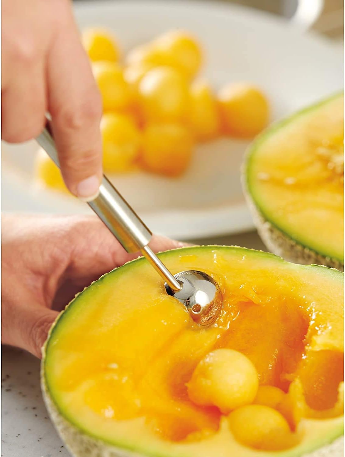 Inhalt: 1x Kugelausstecher/ Melonenausstecher (Länge 15 cm, Ø 2,5 cm) mit einem Ablaufloch in der Kelle - Artikelnummer: 1871266030 Material: Cromargan Edelstahl 18/10, teilmattiert. Rostfrei, spülmaschinengeeignet, formstabil, hygienisch, säurefest und unverwüstlich Der kleine Portionierer formt mühelos Obst- und Gemüse-Kugeln für süße und herzhafte Salate. Mit der Halbkugel lassen sich schöne Bällchen aus Gurken, Mangos, Melonen, Avocados uvm. Ausstechen Neben dekotrativen Melonen- oder Butterkugeln eignet sich der Kugelformer auch zum vollständigen Aushöhlen von Obst und Gemüse oder zum Entfernen von Kernen aus einer Schlangengurke oder Zucchini Sicheres Halten beim Zubereiten durch den schmalen, handlichen Griff. Die Funktionsteile sind fest im Griff einzementiert. Mit praktischer Öse zur Aufbewahrung an einer Hängeleiste mit Haken | قیمت یورویی : 12.9€