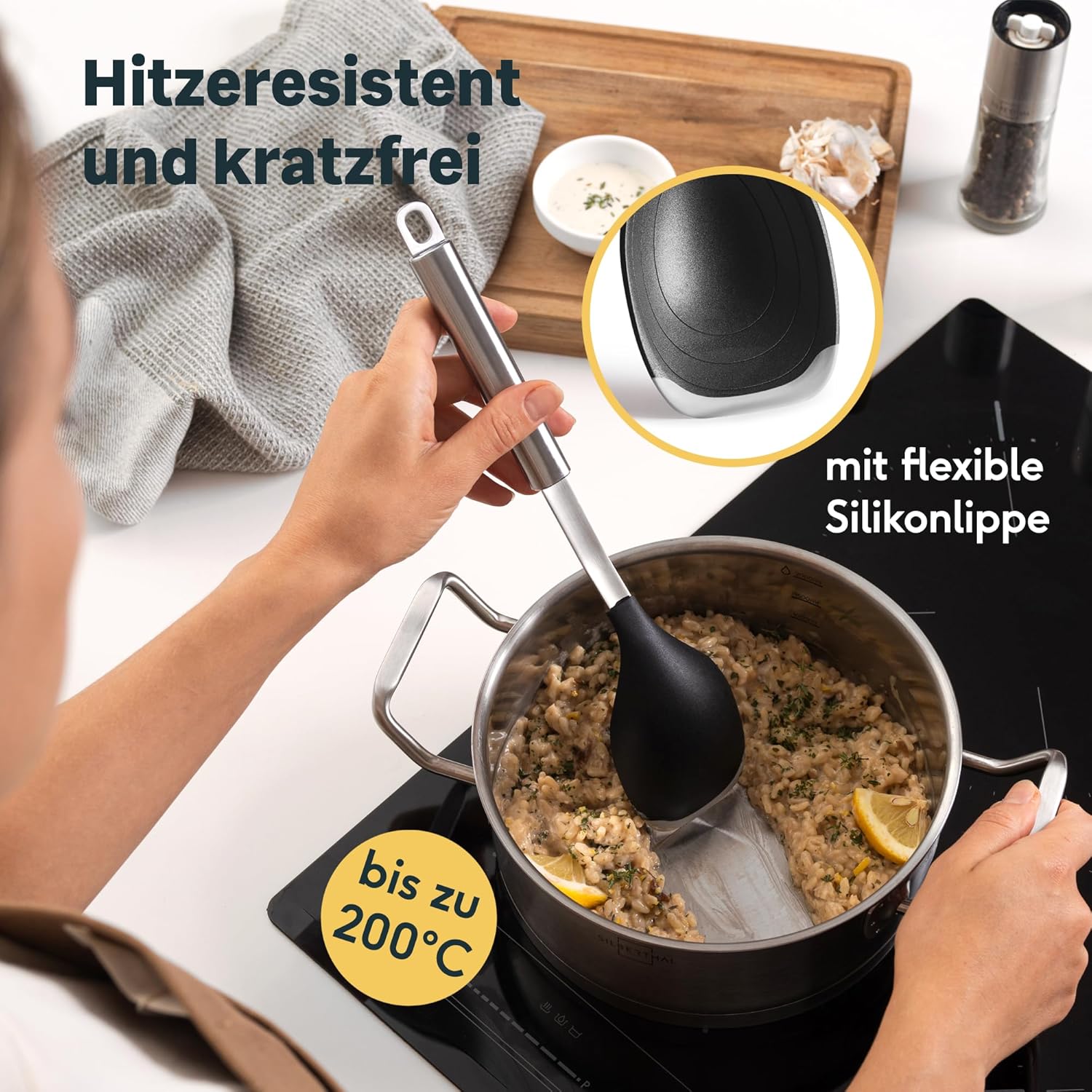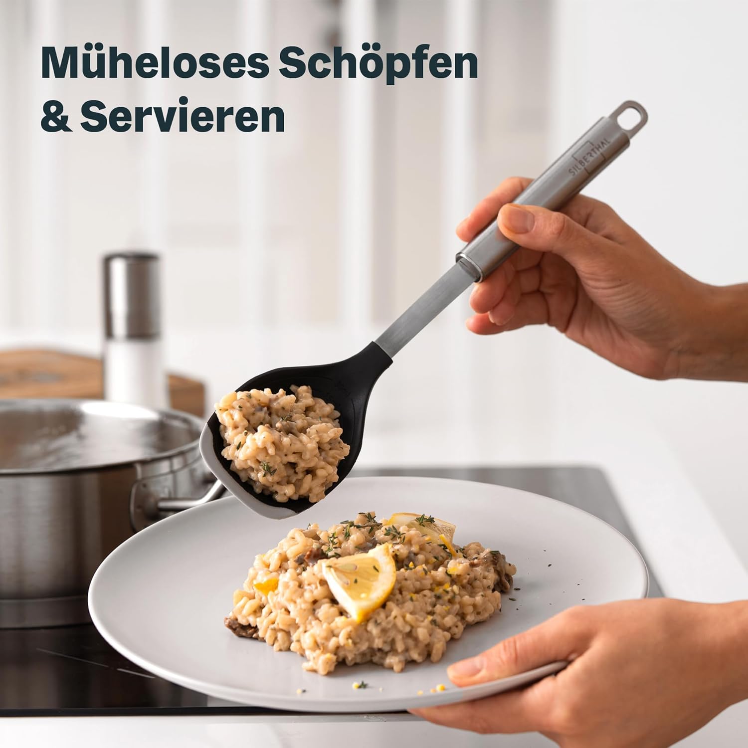SILBERTHAL Servierlöffel mit Edelstahl Griff und Silikonlippe - Vorlegelöffel für beschichtete Pfannen - Hitzebeständig und spülmaschinengeeignet | قیمت یورویی 9.95€