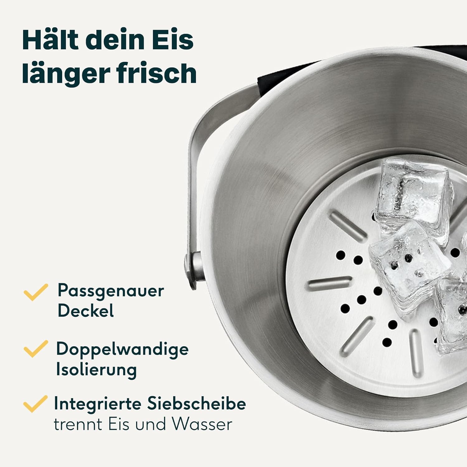 ✔ 3 Liter | 1,2 kg | 45 Eiswürfel Volumen. Großer, eleganter Eiseimer mit Deckel und Zange aus mattem Edelstahl und großer Füllkapazität. ✔ Ganze Nacht lang gekühlt - Doppelwandig isolierte Konstruktion schützt das Eis vor dem Schmelzen. Dank Sieb bleiben Eiswürfel formschön und vom Eiswasser getrennt. Herkömmliche Eimer lassen das Eis schneller schmelzen. ✔ Stilvoll Servieren - Der Tragegriff ist mit rutschfestem Silikon ummantelt. Deckel zum Einhängen, um die Hände frei zu haben zum hygienischen Servieren per mitgelieferter Zange. ✔ Modern & Zeitlos - Mit elegantem Design stets eine stilvolle Präsentation von Drinks für festliche Tafeln, an der Hausbar oder auf Partys. Mit der breiten Basis ist der Eimer standfest. ✔ Kinderleichte Reinigung - Der Kühlbehälter lässt sich einfach per Hand reinigen und ist rostfrei. Außerdem nicht nur zum Kühlen von Flaschen, sondern auch zur Zubereitung von Bowle oder als Dekoschale für Früchte & Obst. | قیمت یورویی : 39.95€