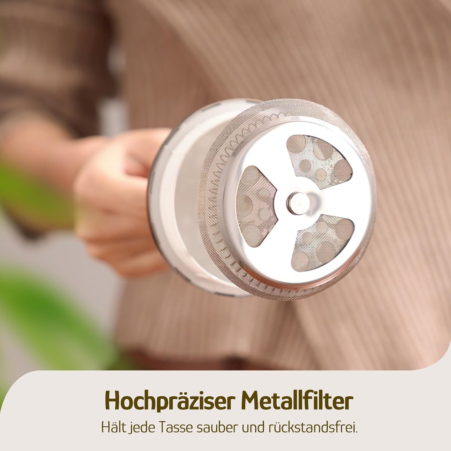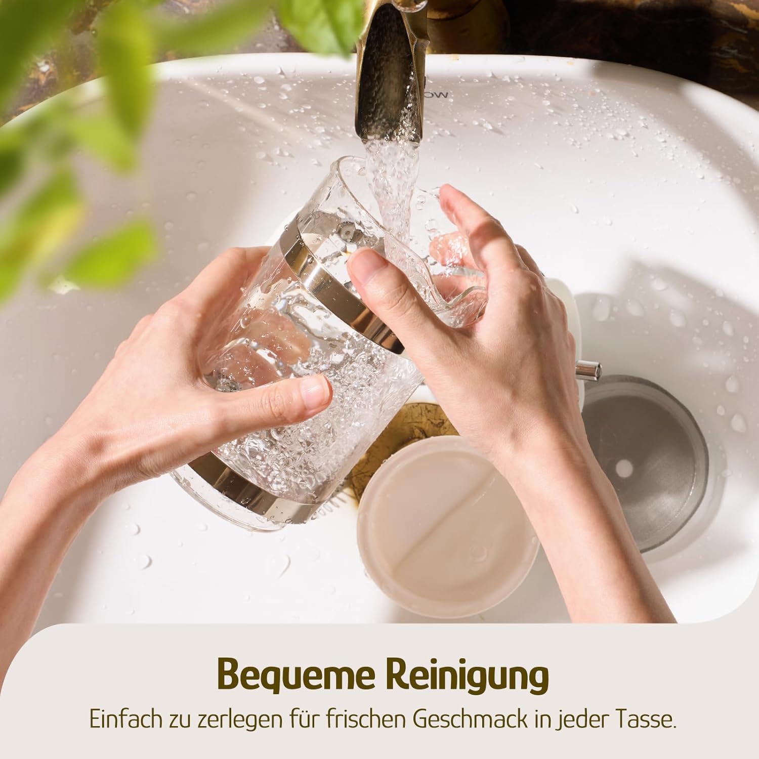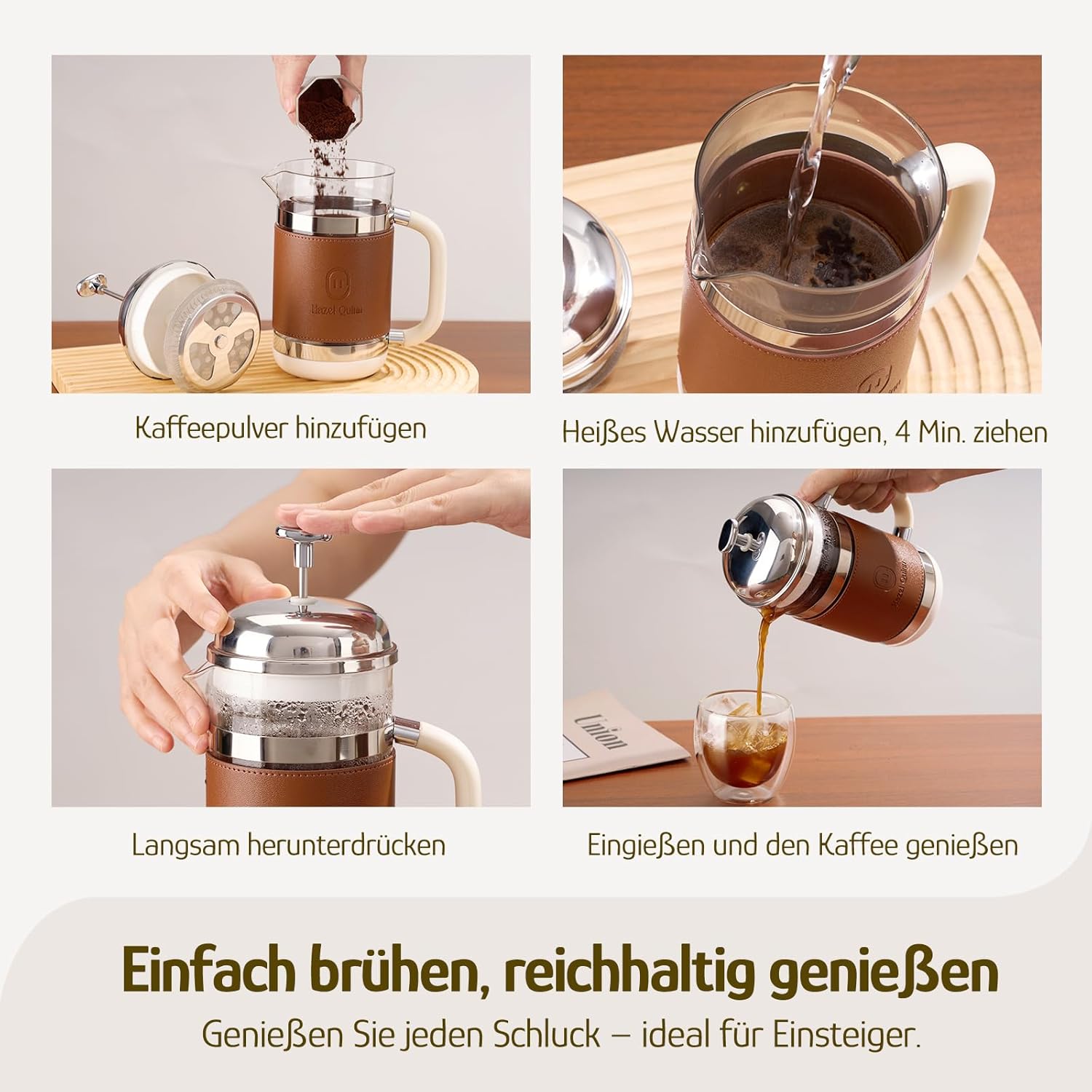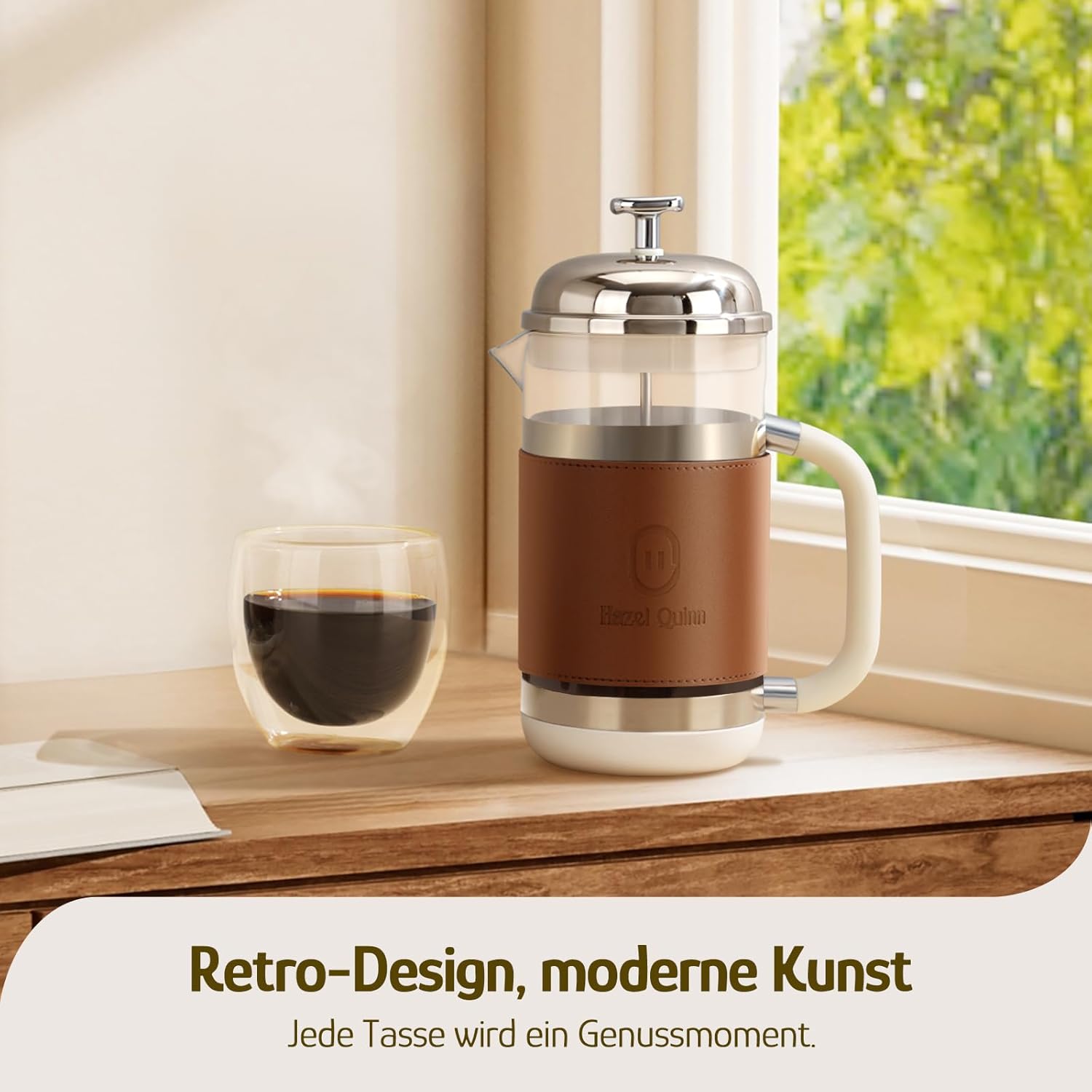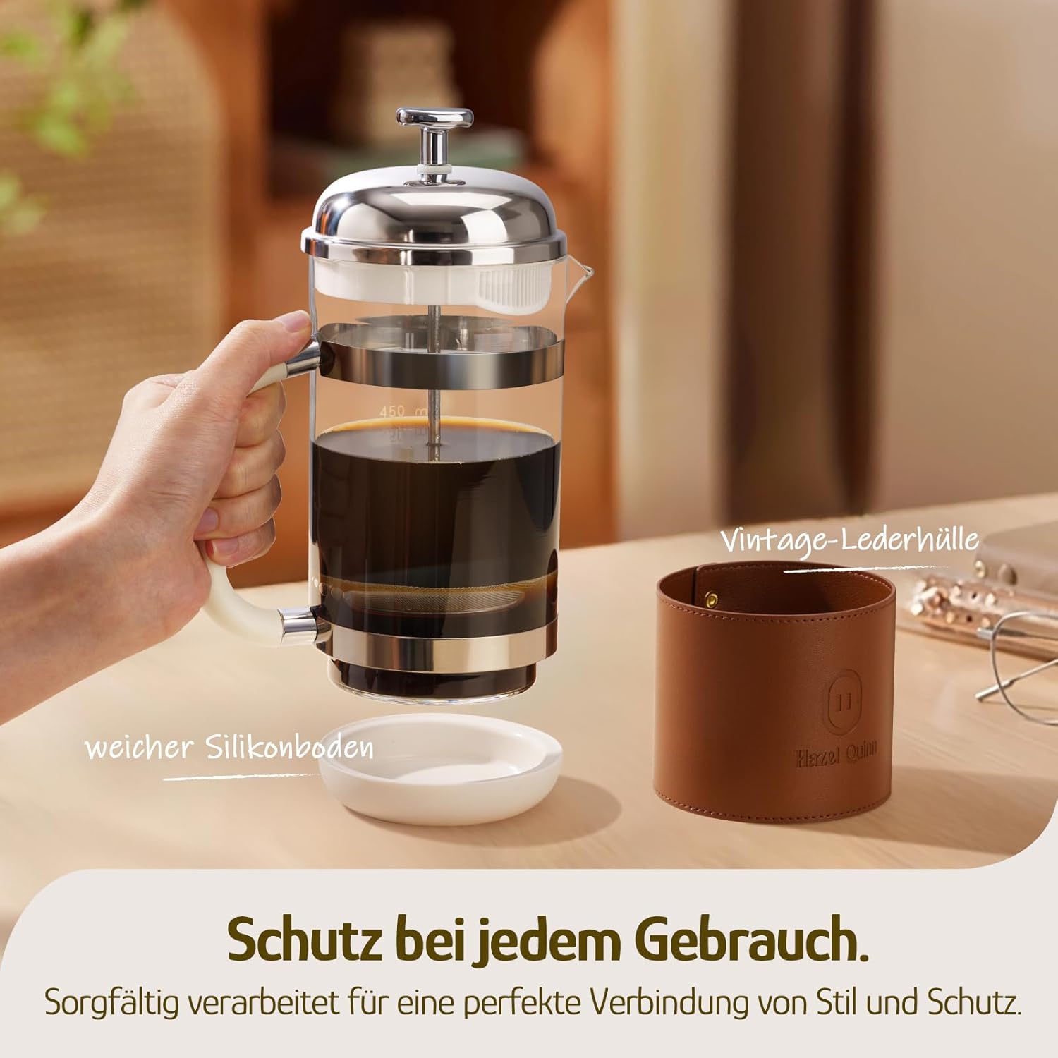 [Hergestellt für Qualität] Die Hazel Quinn French Press Kaffeekanne aus hitzebeständigem Borosilikatglas garantiert Langlebigkeit und Sicherheit. BPA-frei und auf langjährige Nutzung ausgelegt, ist sie die perfekte Wahl für alle, die Gesundheit und Robustheit in ihrer Kaffeeroutine schätzen. [Premium-Kaffeegenuss entfesselt] Die Hazel Quinn French Press aus laborgeprüftem Borosilikatglas mit 4-fach Edelstahl-Meshfilter holt das volle Aroma Ihrer Bohnen heraus – ohne Bitterstoffe & Kaffeepartikel. Genießen Sie perfekt filtrierten Kaffee, bei dem jeder Schluck die echte Geschmacksnuance offenbart. [Perfektion in 4 Schritten – Ihre French Press für Tee & Kaffee] Entdecken Sie die Kunst des perfekten Aufbrühens! Ob frisch gemahlener Kaffee, loser Blatttee oder aromatische Kräuter – mit unserer stylischen Presse zaubern Sie in nur 4 einfachen Schritten Ihr Lieblingsgetränk. [Persönliche Perfektion] Genießen Sie die perfekte Menge mit einer Kapazität von 450 ml – ideal für 1-2 Tassen. Die integrierte Wasserstandsanzeige ermöglicht eine präzise Brühkontrolle, sodass jede Tasse genau nach Ihrem Geschmack zubereitet wird. Perfekt für Kaffeeliebhaber, die Wert auf Individualität und Genuss legen. [Zeitloses Design, moderner Touch] Diese French Press kombiniert einen abnehmbaren Ledermantel mit einer weichen Silikonbasis – perfekt, um Ihre Hände vor Hitze und Ihre Arbeitsplatte vor Verschüttungen zu schützen. Nostalgischer Charme trifft auf moderne Funktionalität. Ideal für stilbewusste Kaffeeliebhaber, die Eleganz und Komfort schätzen. | قیمت یورویی : 29.99€