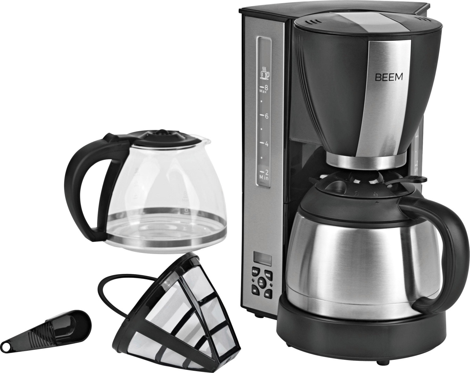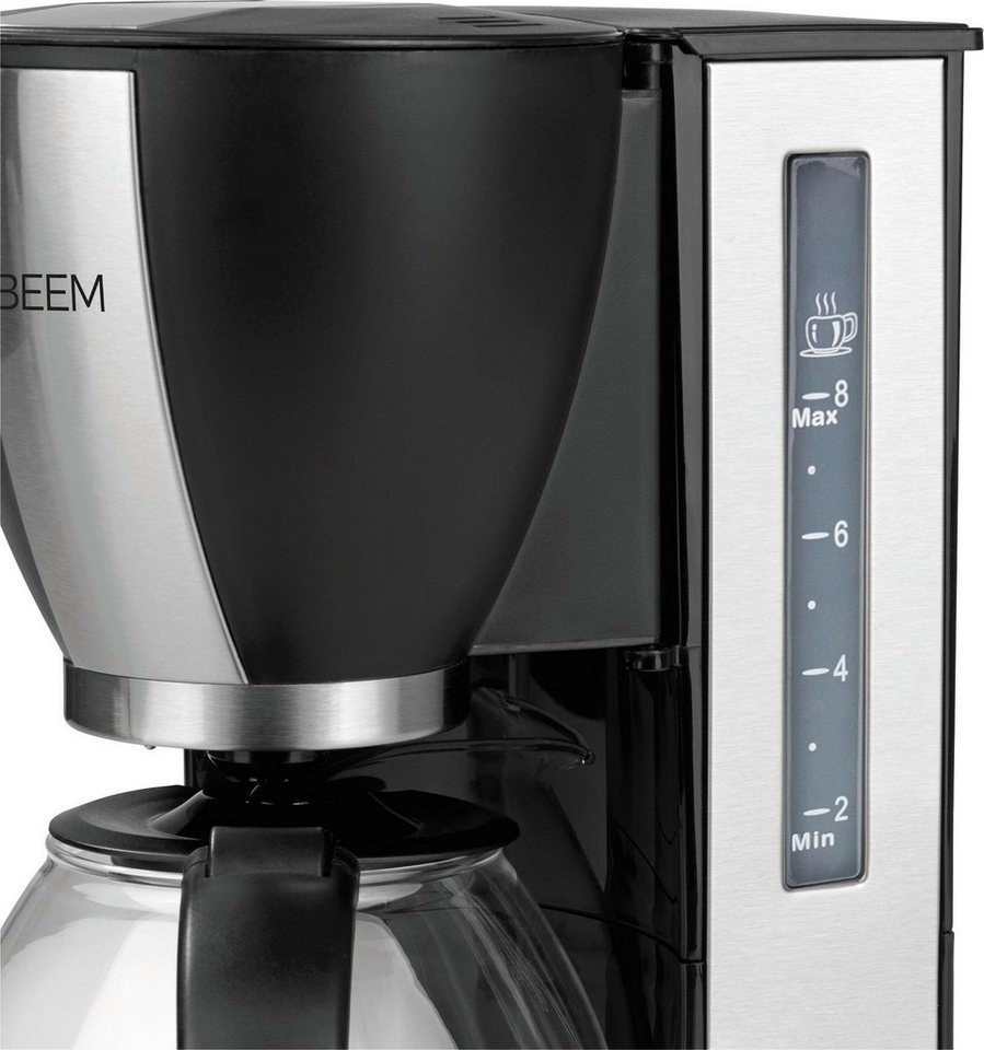 قهوهساز BEEM Fresh-Aroma-Select Duo با توان ۱۰۰۰ وات، مجهز به فیلتر دائمی قابل شستوشو، تایمر ۲۴ ساعته، عملکرد گرمنگهدارنده، و دو قوری (شیشهای و استیل) برای تهیه تا ۸ فنجان قهوه تازه و خوشعطر است.