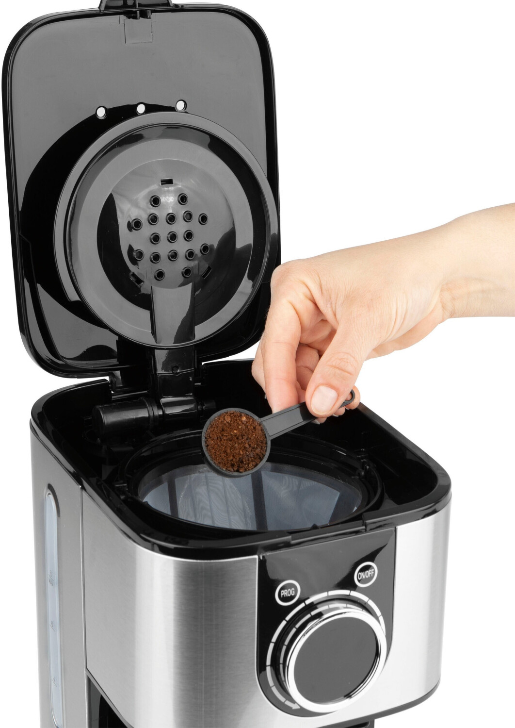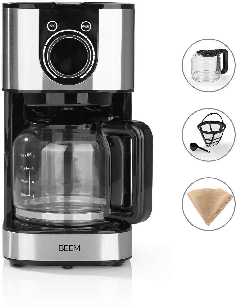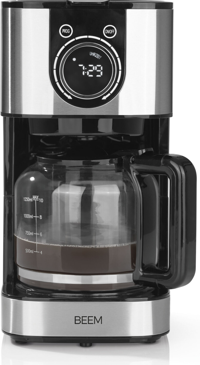 قهوهساز Beem Kaffeemaschine Fresh-Aroma-Switch Glas 900W Edelstahl/schwarz با طراحی استیل ضدزنگ، مجهز به صفحه نمایش لمسی، تایمر ۲۴ ساعته، فیلتر دائمی قابل شستوشو و قوری شیشهای ۱.۲۵ لیتری برای تهیه تا ۱۰ فنجان قهوه تازه و خوشعطر.