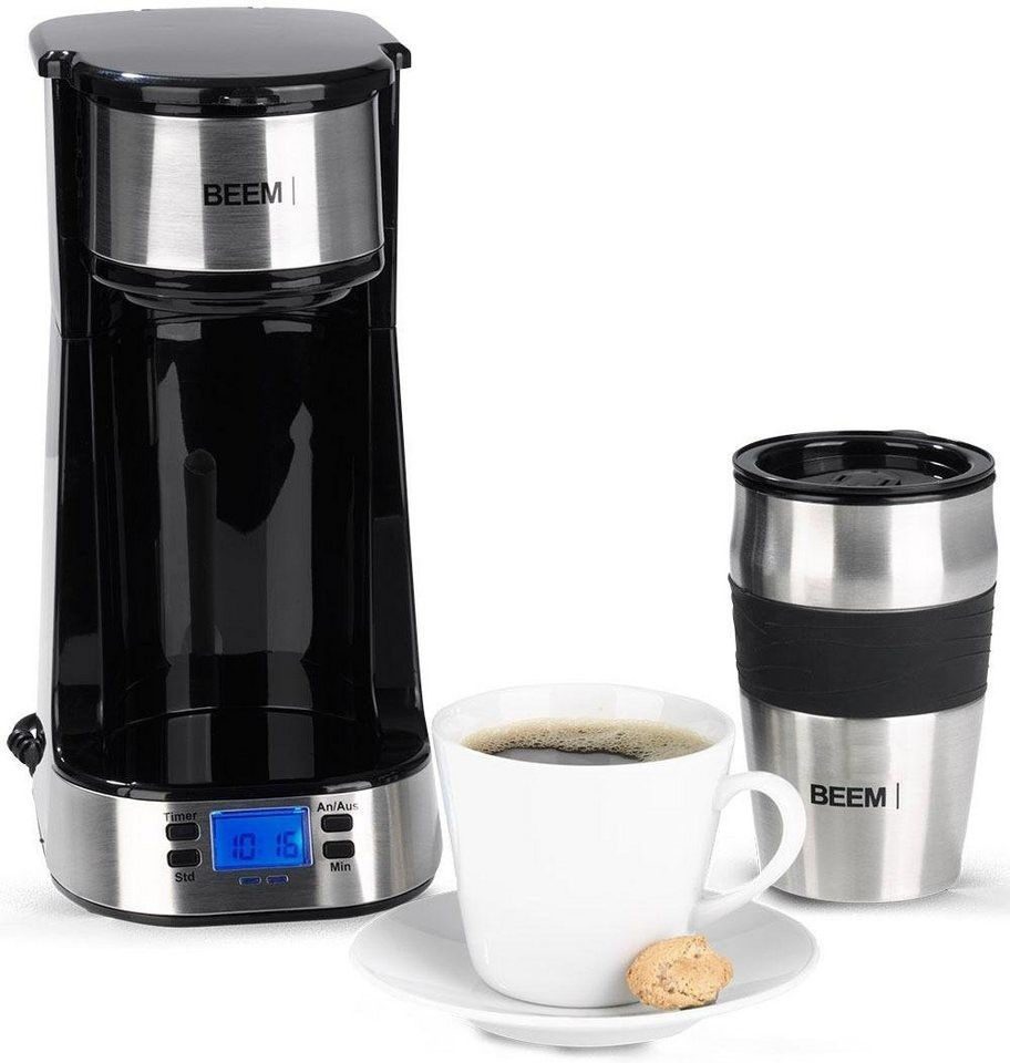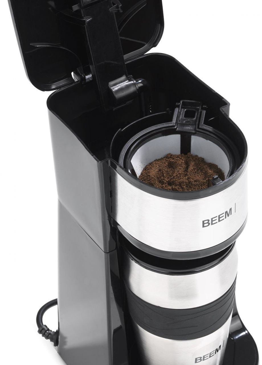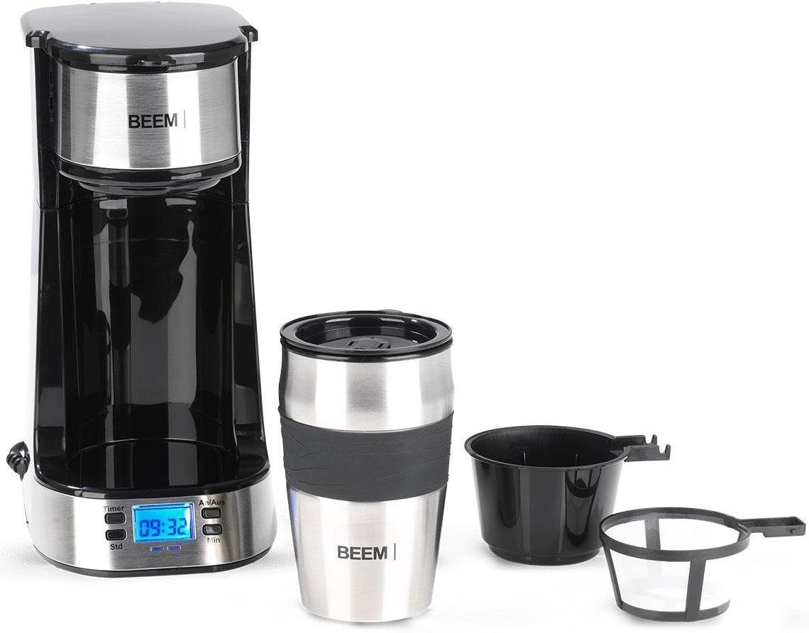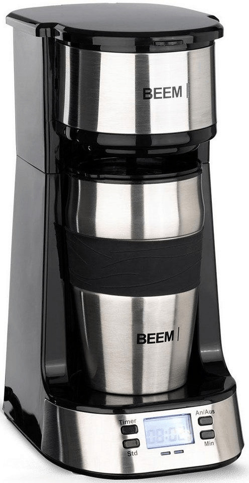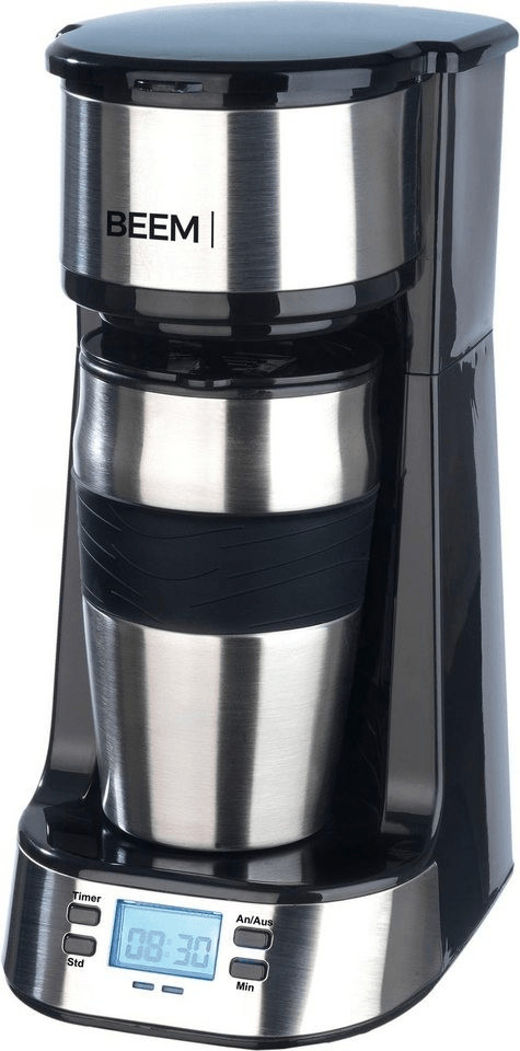 قهوهساز Beem Single-Filterkaffeemaschine 1510SR با طراحی جمعوجور، مجهز به تایمر ۲۴ ساعته، فیلتر دائمی قابل شستوشو و فنجان حرارتی دوجداره ۰.۴ لیتری برای تهیه سریع و آسان قهوه تکی.