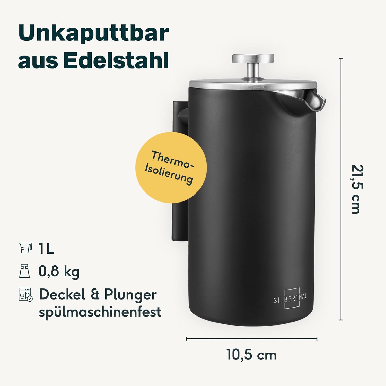 SILBERTHAL French Press Thermo 1 Liter - Kaffeebereiter Edelstahl - Doppelwandig isolierte Kaffeepresse für Outdoor - Kaffeekanne zum Verschenken Schwarz | قیمت یورویی 37.95€
