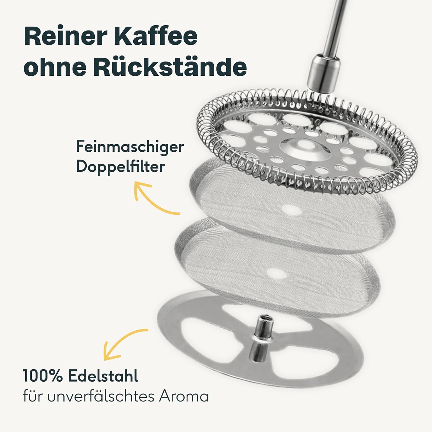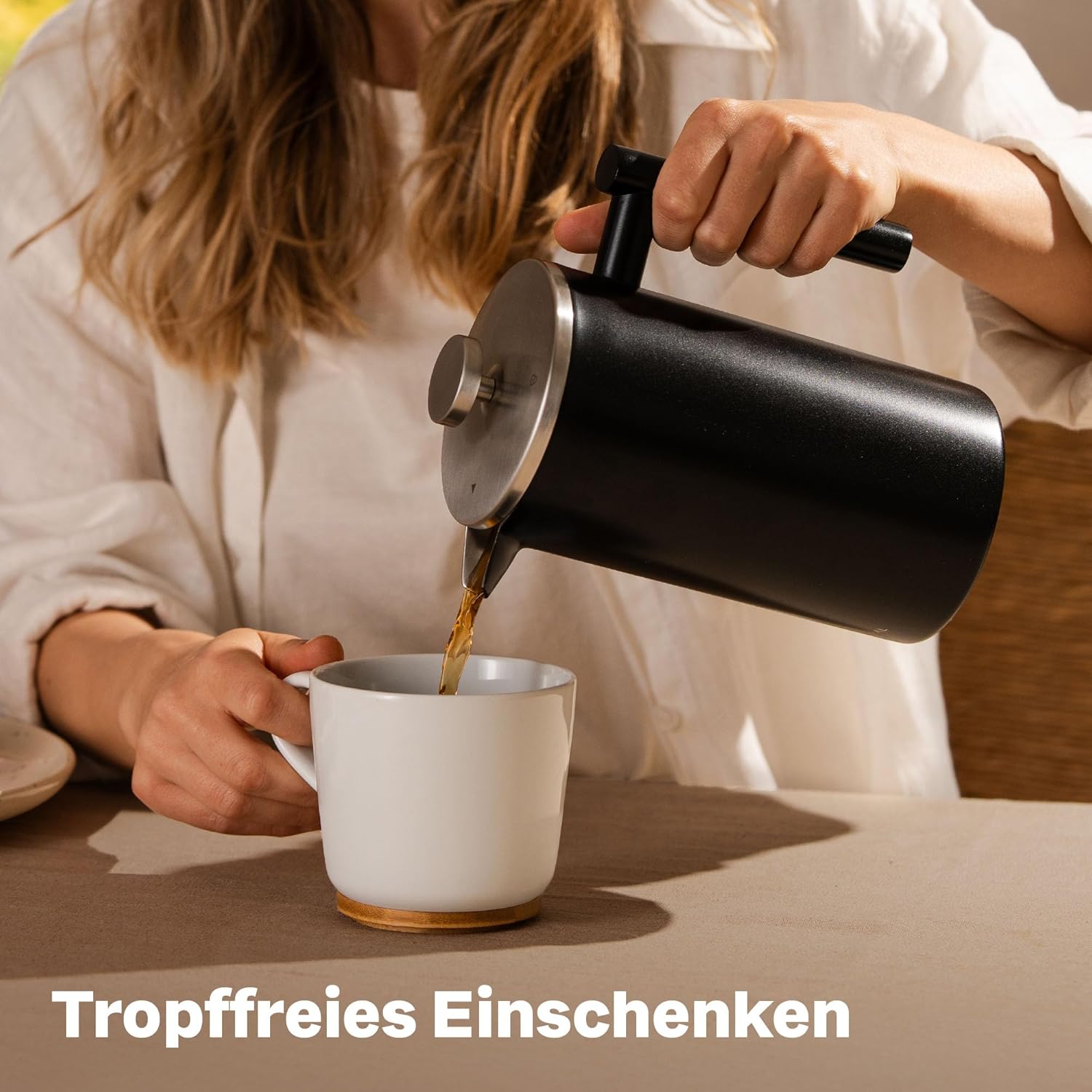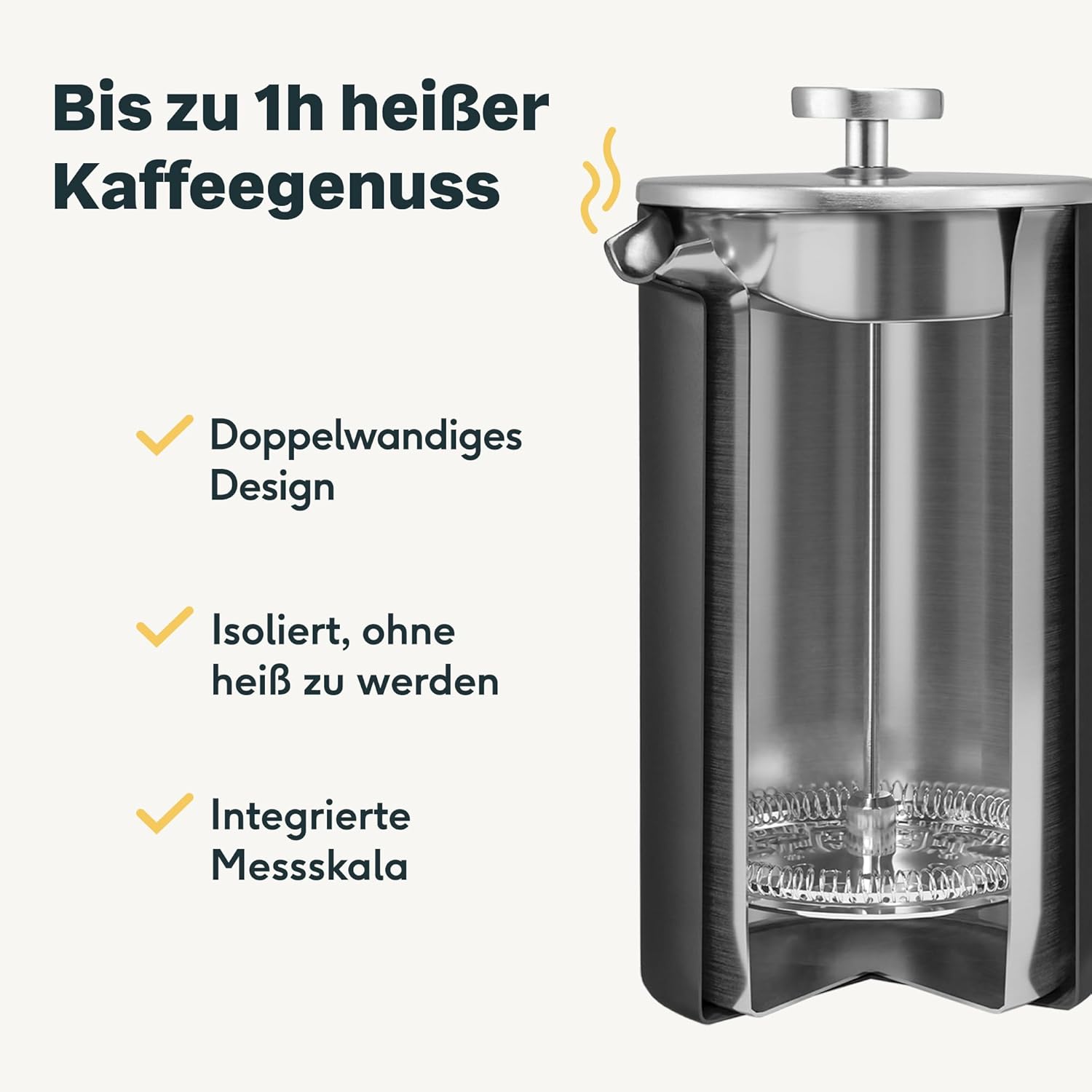 ✔ Kaffee 1h warm ohne Strom - Doppelwandig thermoisolierte Kanne, mit noch besserer Wärmeisolierung, hält Kaffee und Tee bis zu 1h warm. ✔ Für ein ausgiebiges Frühstück. Lieblings Kaffee gemahlen einfüllen, heißes Wasser rein & ziehen lassen. Dann Kolben herunterdrücken für eine leckere Tasse Kaffee ohne Metallgeschmack. ✔ Doppeltfilter für ausgezeichneten Geschmack – Der feine Doppelfilter erhält natürliche Aromen und Öle und sorgt für rückstandslosen Kaffeegenuss ohne Rückstände. ✔ Versatil – die Kaffeekanne aus robustem Edelstahl eignet sich hervorragend fürs Camping. Genieße deinen Kaffee on the go. Geheimtipp: auch als Cold Brew Coffee Maker nutzbar. ✔ Flexibel & Praktisch – mit 1l Fassungsvermögen bist du von 1 bis 6 Tassen jederzeit versorgt. Ob nur für dich und den kleinen Kaffee-Boost oder zum Brunch mit der Familie. | قیمت یورویی : 37.95€