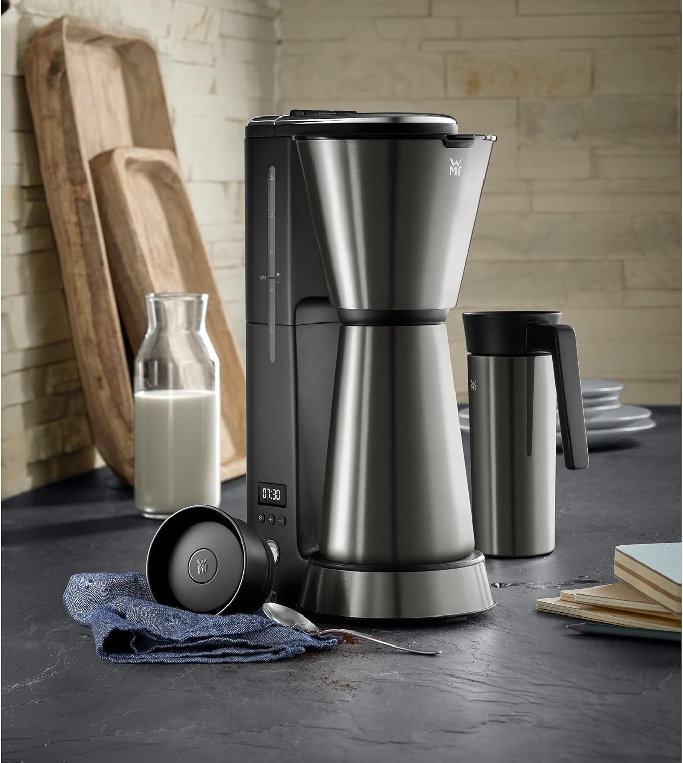 قهوهساز WMF KÜCHENminis Aroma Thermo to go Deep Black با طراحی کمحجم، بدنهی استیل Cromargan®، قابلیت تهیهی ۵ فنجان قهوه و امکاناتی مانند تایمر، فیلتر قابل شستوشو و لیوان حرارتی همراه، انتخابی ایدهآل برای استفادهی روزمره و سفر است.