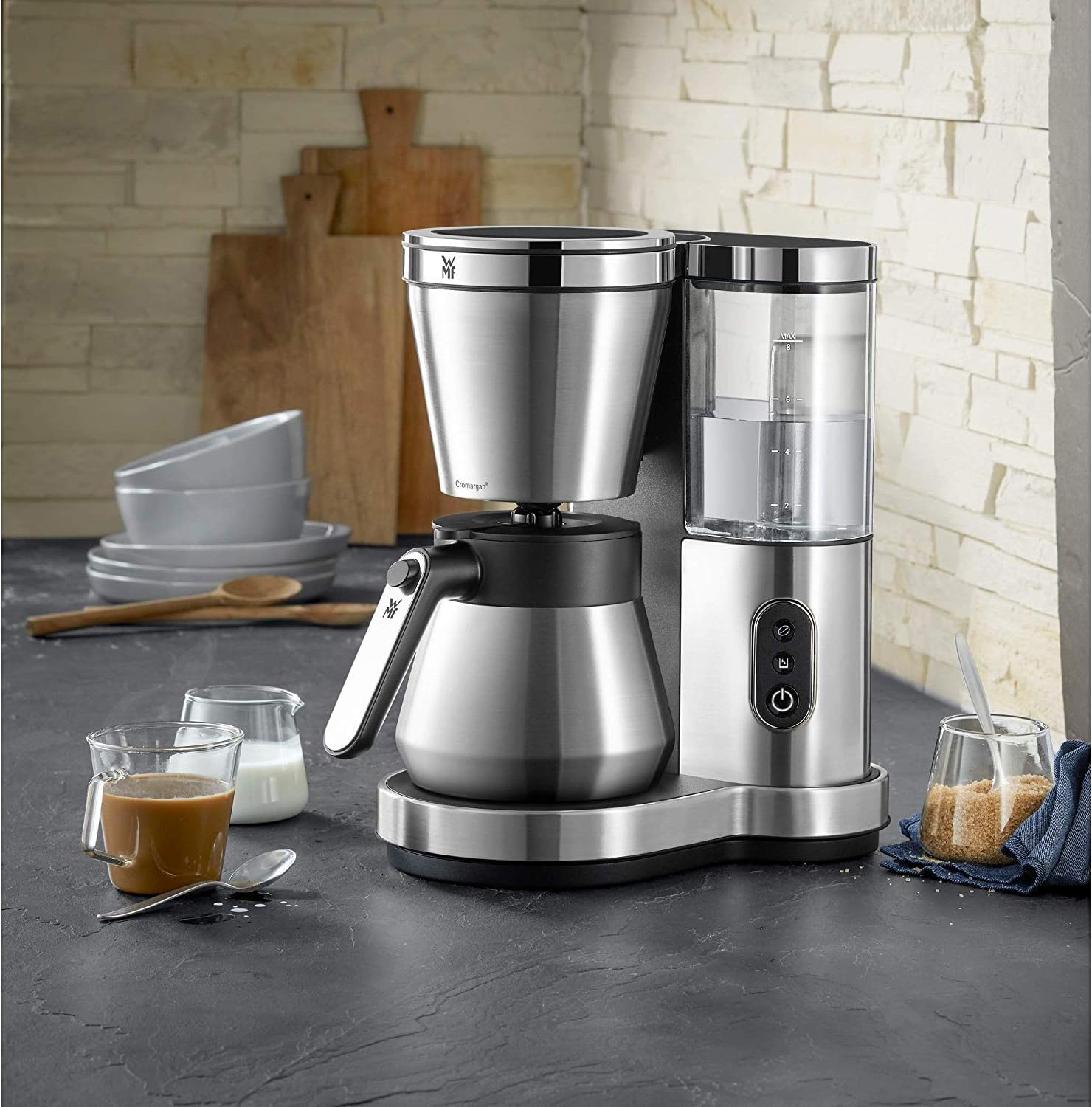 قهوهساز WMF Lono Aroma Thermo با بدنهی استیل Cromargan®، قابلیت تهیهی ۸ فنجان قهوه و امکاناتی مانند تایمر، فیلتر قابل شستوشو و لیوان حرارتی همراه، انتخابی ایدهآل برای استفادهی روزمره و مهمانیها است.