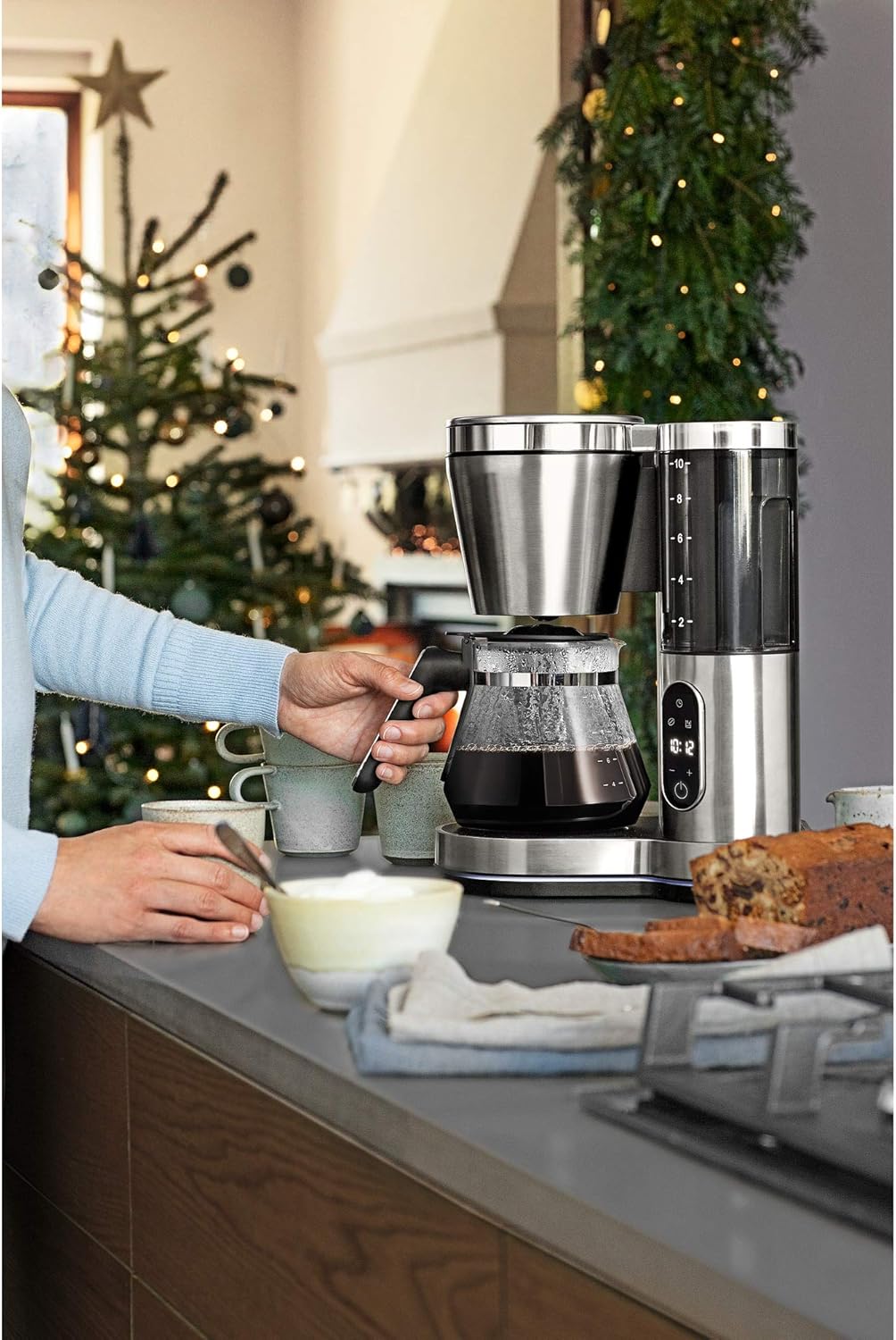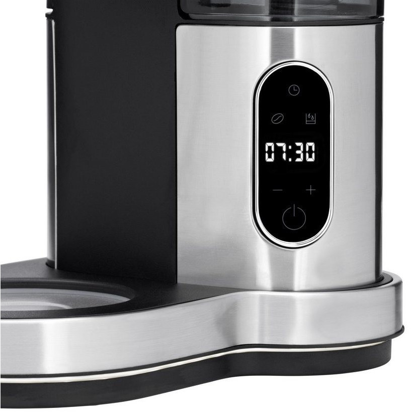 این مدل با ظرفیت ۱.۲۵ لیتر، امکان تهیه ۱۰ فنجان قهوه را در یک نوبت فراهم میکند. قابلیت برنامهریزی دیجیتال ۲۴ ساعته به شما اجازه میدهد زمان شروع دمآوری قهوه را از قبل تنظیم کنید و صبحها با عطر قهوه تازه بیدار شوید. صفحه نمایش دیجیتال و کلیدهای لمسی، کار با دستگاه را بسیار ساده و سریع کردهاند.