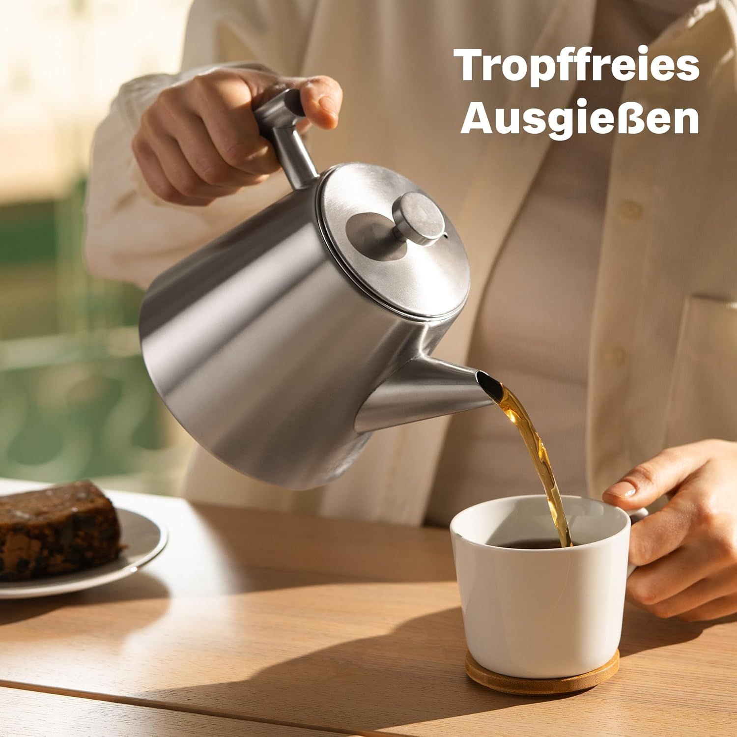 ✔ Voller Teegenuss mit Stil – Moderne Kanne im zeitlosen Design. 1 L Fassungsvermögen für ausreichend Tee und gemütliche Zeit. ✔ Stressfrei genießen – die doppelwandige Isolierung an Kanne und Deckel halten den Tee bis zu 1h warm. Außerdem bleiben Griff und Deckel kühl. Mit dem Scharnierdeckel geht das Einfüllen auch einhändig. Die speziell geformte Tülle dient zum tropffreien Ausgießen. ✔ Ultrafeines Sieb – Das Teesieb aus Edelstahl vermeidet Teerest im Glas oder in der Kanne und reicht bis zum Boden für volles Aroma auch bei kleinen Mengen. Das Sieb lässt sich auch herausnehmen, für optimale Brühzeit. ✔ Für jeden Teetyp – Ob mit Teebeutel, losem Tee oder größeren Zutaten, wie Minze, Zimt oder Sternanis, dank dem Ausgussfilter bleiben auch diese in der Kanne. Das Ideale Geschenk für jeden Tee-Liebhaber. ✔ Leichte Reinigung – Die Komponenten lassen sich auseinanderbauen und kinderleicht per Hand säubern, dank rostfreiem 18/10 Edelstahl. Die Robuste, doppelwandige Bauweise macht die Teekanne stoßfest & praktisch unkaputtbar. Ein treuer Begleiter im Alltag. | قیمت یورویی : 44.95€