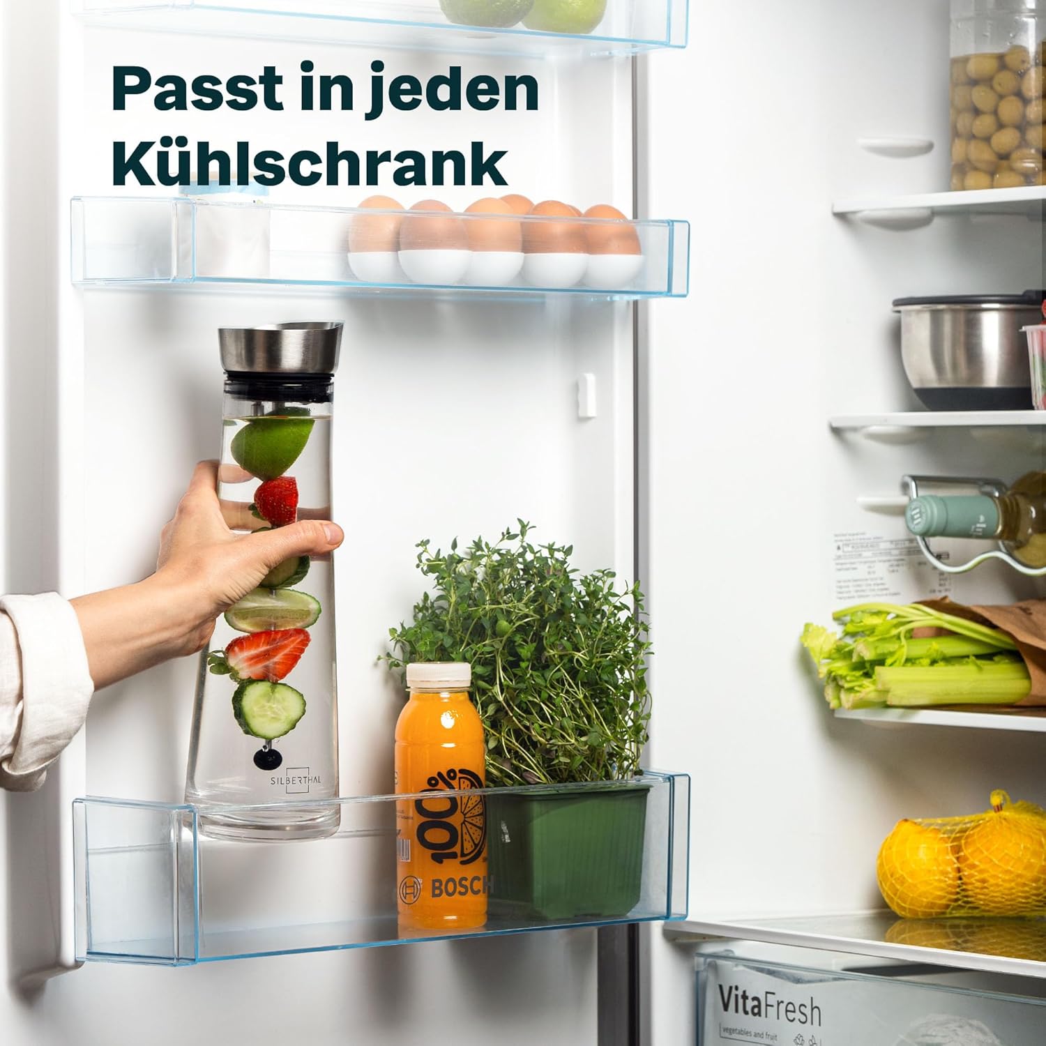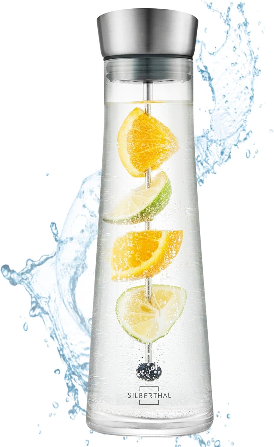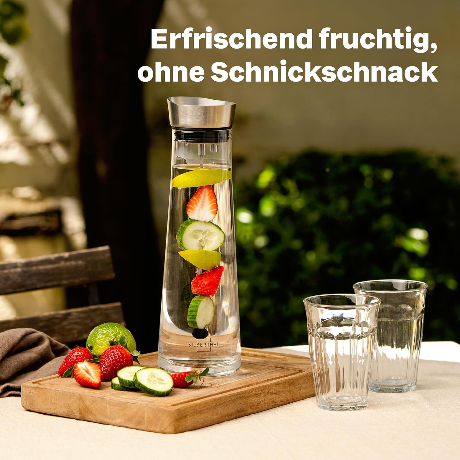 SILBERTHAL Glaskaraffe mit Deckel und mit Fruchtspieß - Edelstahl Deckel öffnet mit Kippen - Wasserkaraffe mit Fruchtsieb Transparent 1 Liter Schmal | قیمت یورویی 29.95€