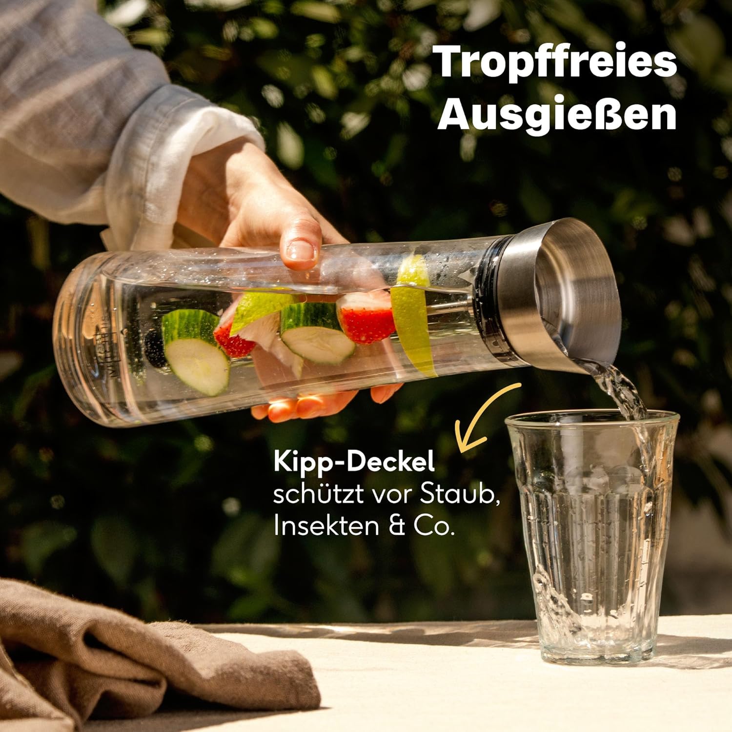 ✔ Mit Fruchtspieß - Für aufregendes Infused Water mit Früchten, wie Zitrone, Limetten oder Kräuter. Der lange herausnehmbare Fruchteinsatz und Filter am Ausguss halten die Fruchtstückchen zurück. Alles BPA-frei. ✔ Tropffrei & ohne extra Griffe - Durch den Kippverschluss des Deckels öffnet und schließt sich dieser beim Eingießen automatisch. Andere Zutaten wie Eis werden vom Filter am Deckel zurückgehalten. Fliegen & Wespen werden rausgehalten. ✔ Stets Hydriert - eine smarte Lösung, um den Überblick über die getrunkene Menge Wasser am Tag zu behalten. Dank der schmalen Form passt sie auch ideal in den Kühlschrank für kalte Getränke im Sommer. ✔ Reinigung in der Spülmaschine – Alle Einzelteile können auseinandergebaut und ohne Bedenken in der Spülmaschine gereinigt werden. ✔ Eleganz & Funktion - Das moderne und schlichte Design der Karaffe ist auf der Gartenparty, beim Familientreffen und im Alltag ein Hingucker und perfekt zum Darstellen von Kreationen von leckeren Säften, Infused Water oder Tee. | قیمت یورویی : 29.95€
