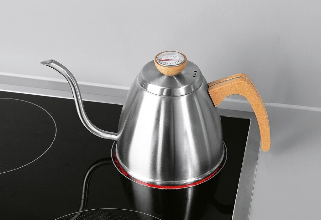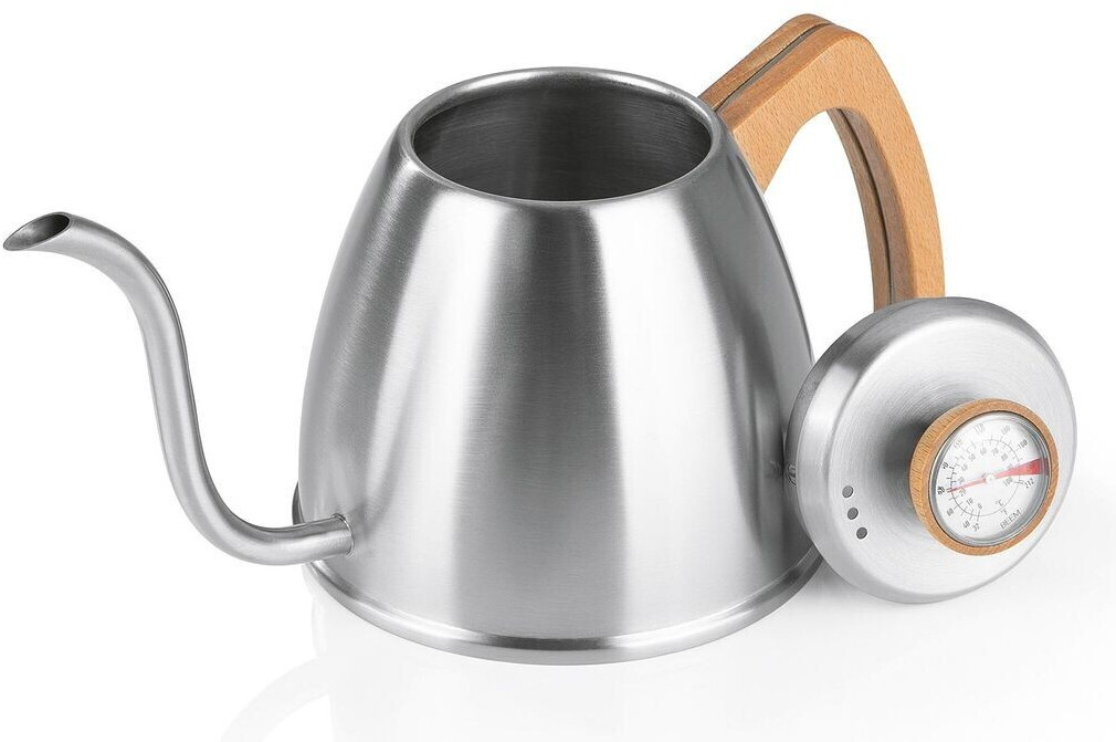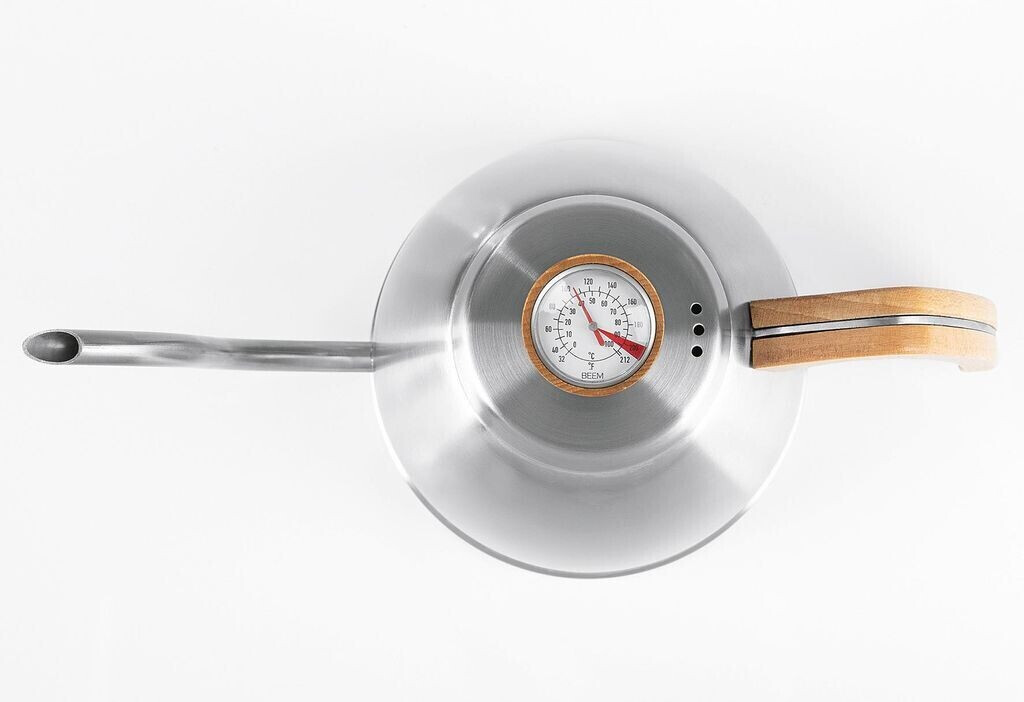 کتری استیل Beem Wasserkessel Edelstahl با ظرفیت 1 لیتر، مجهز به ترمومتر دقیق و دسته چوبی ارگونومیک، انتخابی ایدهآل برای علاقهمندان به دمآوری دقیق قهوه و چای است.