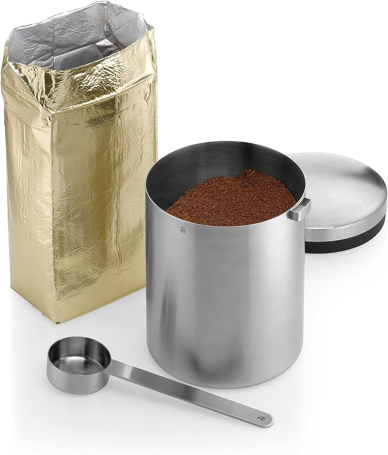 WMF Kult Tee- Kaffeedose Edelstahl für 500g, Edelstahldose mit Maßlöffel, Kaffeebohnen Behälter, Cromargan Edelstahl mattiert, für Kaffeepulver und Kaffeebohnen, spülmaschinengeeignet Single | قیمت یورویی 47.99€