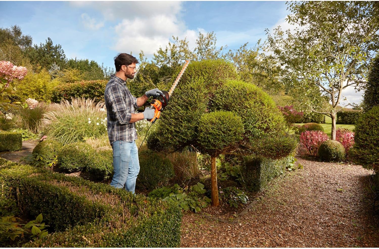 Kraftvolles Schneiden & hohe Schnittleistung: Mit 600 Watt, 60 cm Messerlänge und 25 mm Schnittstärke ist die BLACK+DECKER Heckenschere geeignet für große Hecken Sägeblattspitze für dicke Äste: Ohne zusätzliches Werkzeug können mit der speziellen Sägeblattspitze dickere Zweige bis 35 mm Durchmesser geschnitten werden Verbesserte Sicht: Dank des transparenten Handschutzes haben Sie gute Sicht bei vertikalen Heckenarbeiten, was die Präzision und Sicherheit erhöht Sichere Kabelführung: Die Kabelzugentlastung und der Direktanschluss des Verlängerungskabels sorgen für eine sichere Kabelführung ohne versehentliches Steckerziehen Hohe Flexibilität: Durch den kabellosen Umgang besteht keine Gefahr des Kabeldurchtrennens, der Bügelhandgriff sorgt für hohen Bedienkomfort mit Guteer Kontrolle Leicht und handlich: Mit einem Gewicht von nur 2,6 kg ist die Heckenschere leicht und einfach zu handhaben, was die Arbeit im Garten erheblich erleichtert Schnell-Ladegerät: Das mitgelieferte Schnell-Ladegerät sorgt dafür, dass die Heckenschere schnell wieder einsatzbereit ist, sodass Sie Ihre Gartenarbeit ohne lange Unterbrechungen fortsetzen können Langlebige Messer: Die speziell beschichteten Messer sorgen für eine lange Lebensdauer und bleiben auch bei intensiver Nutzung scharf und effizient Vertrauen in BLACK+DECKER: BLACK+DECKER steht seit Jahrzehnten für Qualität und Zuverlässigkeit, vertrauen Sie auf ein bewährtes Produkt, das Ihre Erwartungen übertrifft Lieferumfang: 1x Elektro-Heckenschere, 1x Messerschutzhülle, alles, was Sie für eine gründliche und sichere Gartenarbeit benötigen | قیمت یورویی : 94.03€