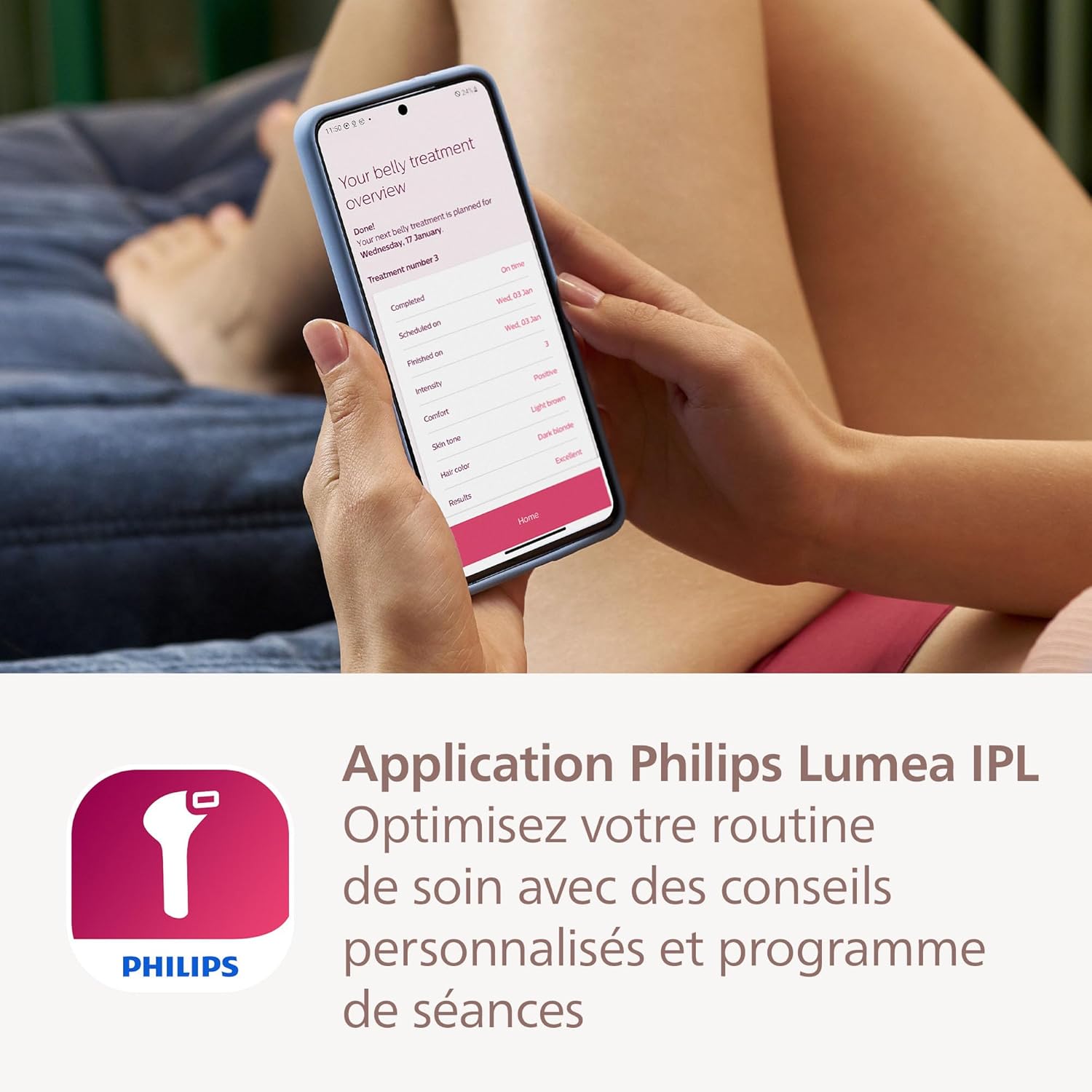Profitez d'une peau lisse plus longtemps : Des tests cliniques montrent que Lumea IPL peut réduire efficacement la pilosité non pas seulement pendant 12 mois, mais jusqu’à 18 mois ! Obtenez jusqu’à 92 % de réduction des poils après seulement 3 séances**, et conservez votre peau lisse pendant 18 mois*. L’emballage peut encore afficher une durée de 12mois Résultats rapides : toutes les 2 semaines pour commencer pendant une période de 6 semaines , puis une fois par mois. Cela représente deux fois moins de séances qu'avec d'autres marques Personnalisation avec SenseIQ : le capteur SmartSkin détecte votre carnation et indique le réglage de luminosité que vous pouvez utiliser, tandis que notre application gratuite vous guide pas à pas dans vos séances 3 embouts incurvés intelligents fournis : les embouts pour le corps, le visage et les zones de précision s'adaptent parfaitement aux courbes de votre corps et déclenchent les programmes les plus efficaces pour chaque zone Formule brevetéeà lumière pulsée Lumea SmartPulse : une puissance équilibrée, une lumière colorée et une durée d'impulsion optimale pour une épilation sûre, efficace et en douceur; Formule basée sur plus de 20 ans de recherche et développement Efficacité prouvée : l'épilateur à lumière pulsée Philips Lumea empêche la repousse des poils pour que vous puissiez profiter d'une peau lisse pendant 18 mois avec jusqu'à 92 % de réduction de la pilosité sur les demi-jambes en seulement 3 séances | قیمت یورویی : 380.21€
