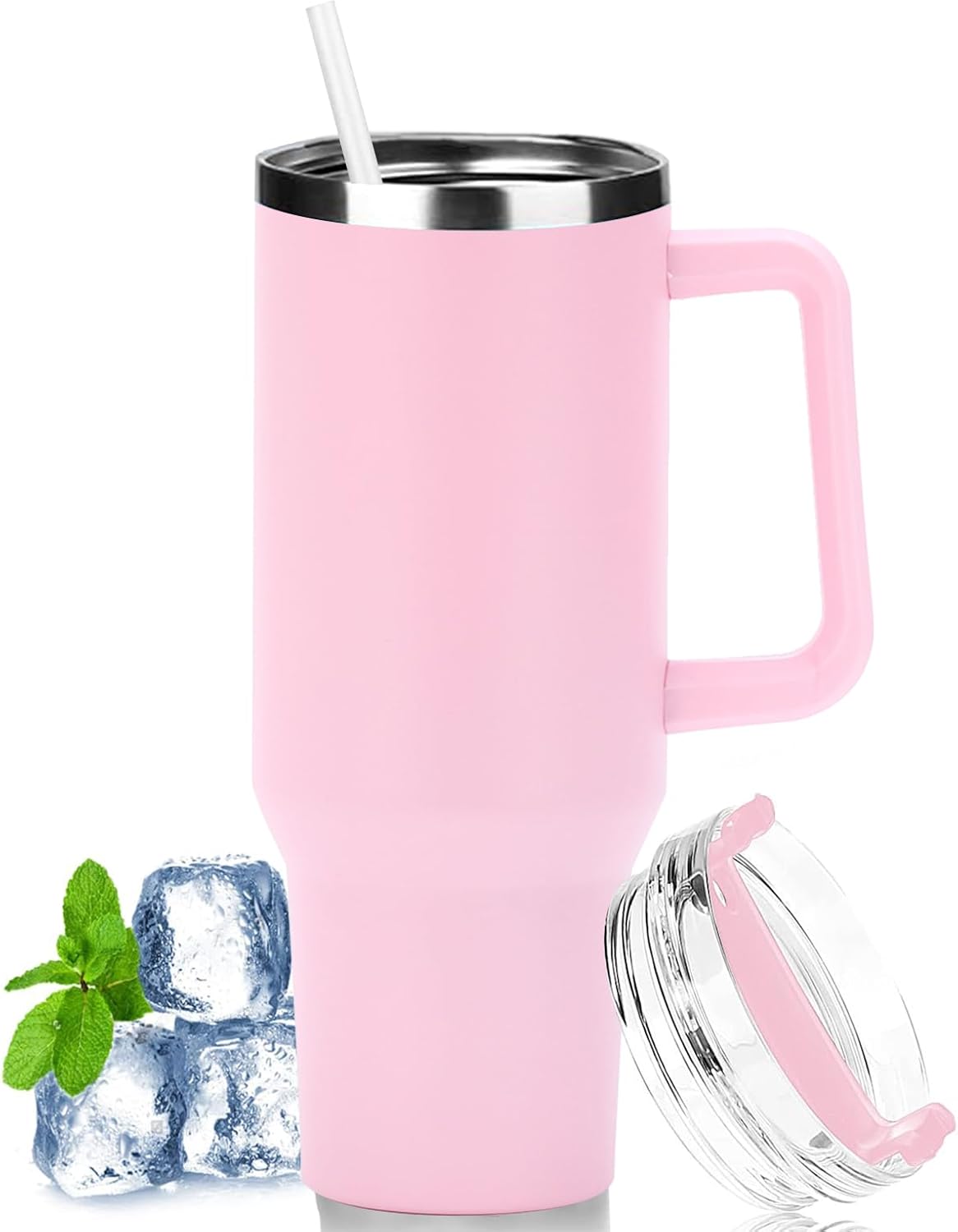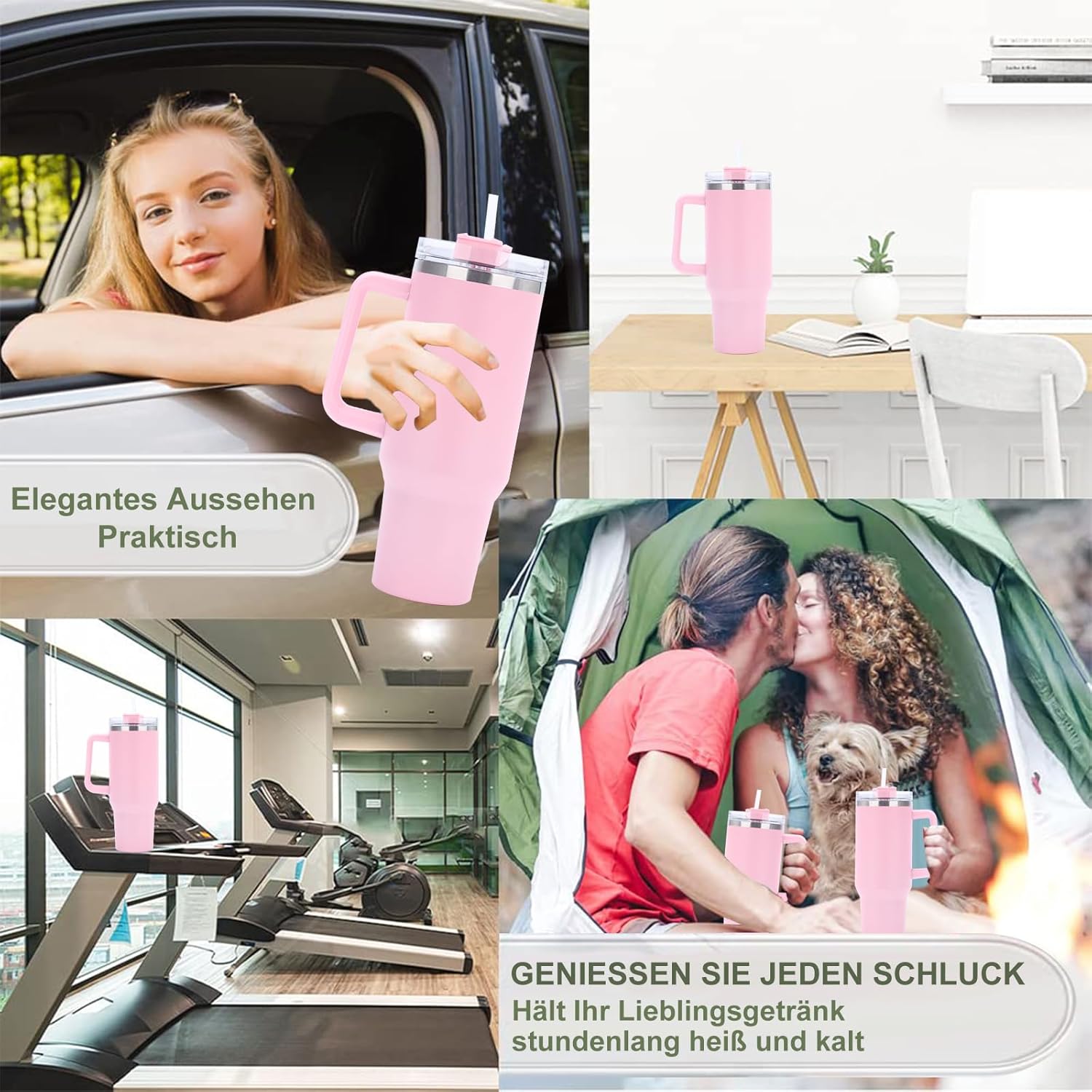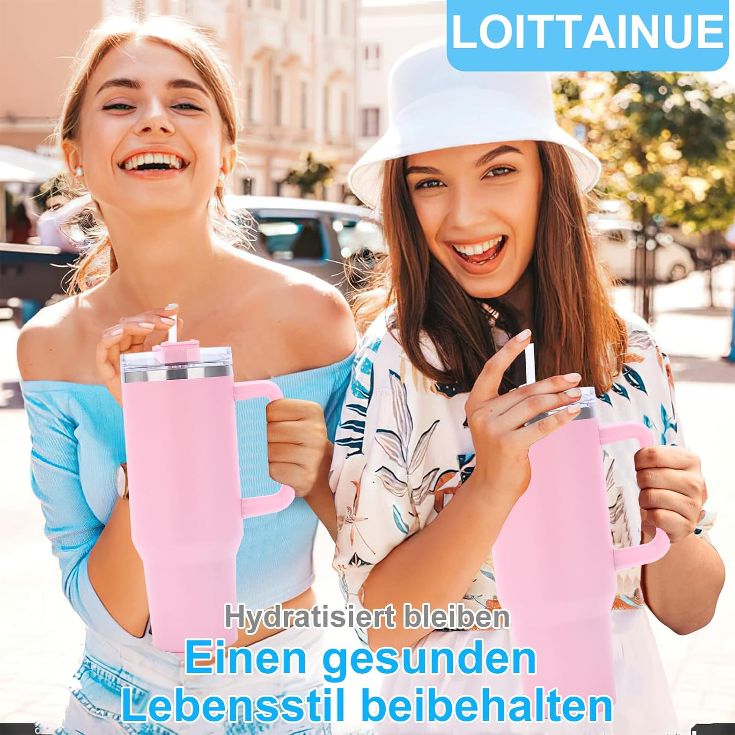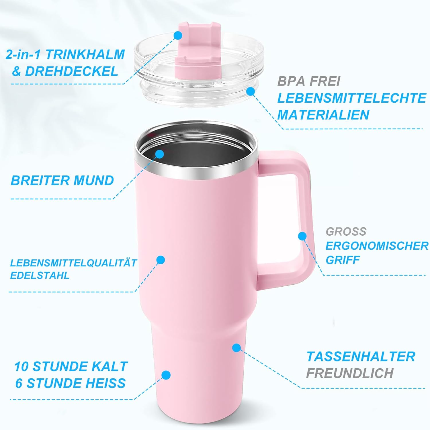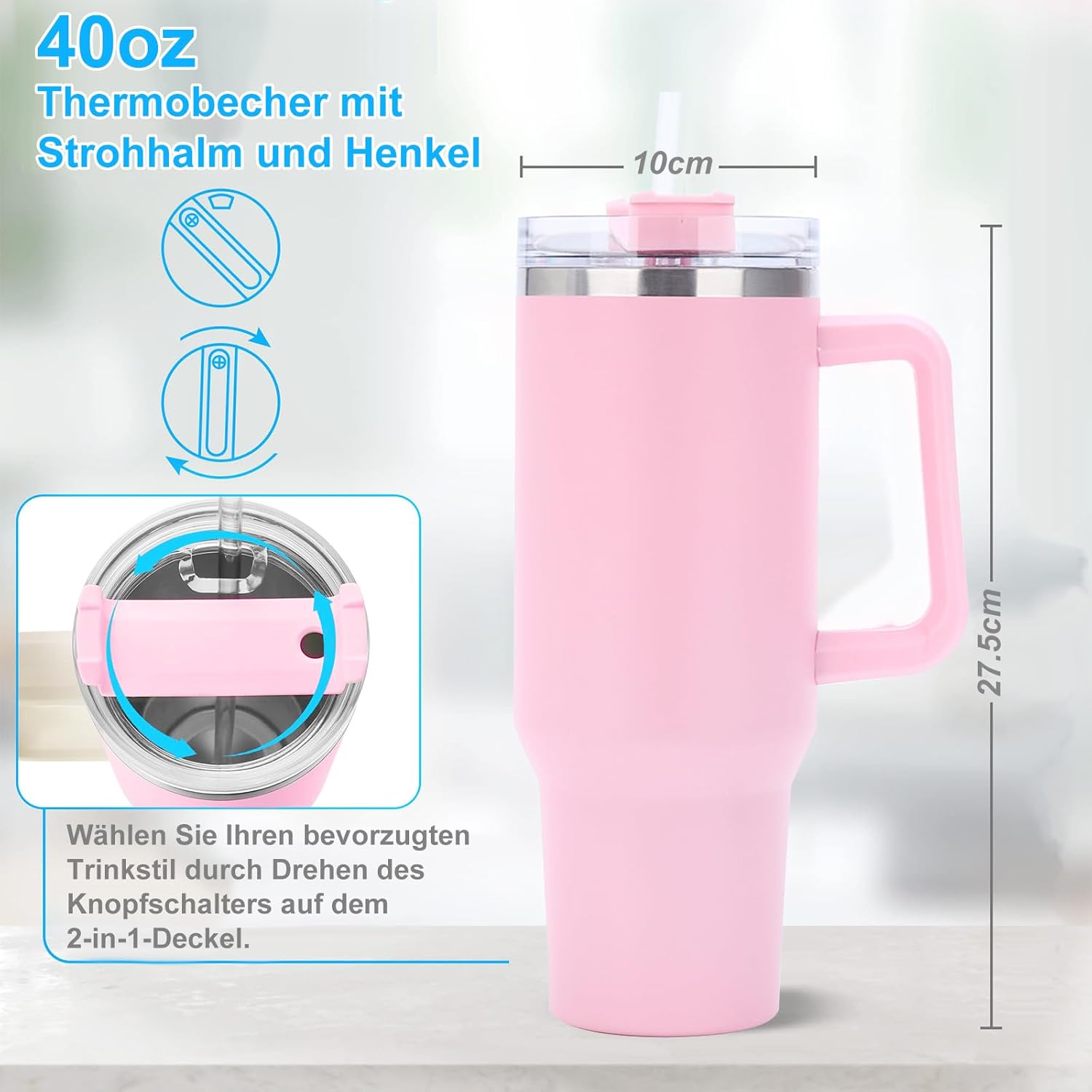 LOITTAINUE 40oz Thermobecher mit Strohhalm und Henkel, 1180ml Kaffeebecher To Go mit Deckel, Doppelwandiger Edelstahl Vakuum Isolierbecher Tragbare Autobecher für Kalte Heiße Getränke (Rosa) | قیمت یورویی 9.99€