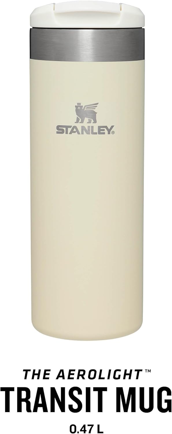 لیوان حرارتی Stanley Aerolight Transit با حجم 0.47 لیتر - 6 ساعت گرم نگه میدارد - قابل شستشو در ماشین ظرفشویی - لیوان قهوه ضد نشت و قابل حمل - سازگار با جا لیوانیهای استاندارد خودرو - فلاسک - کرم 0.47 لیتر - کرم متالیک