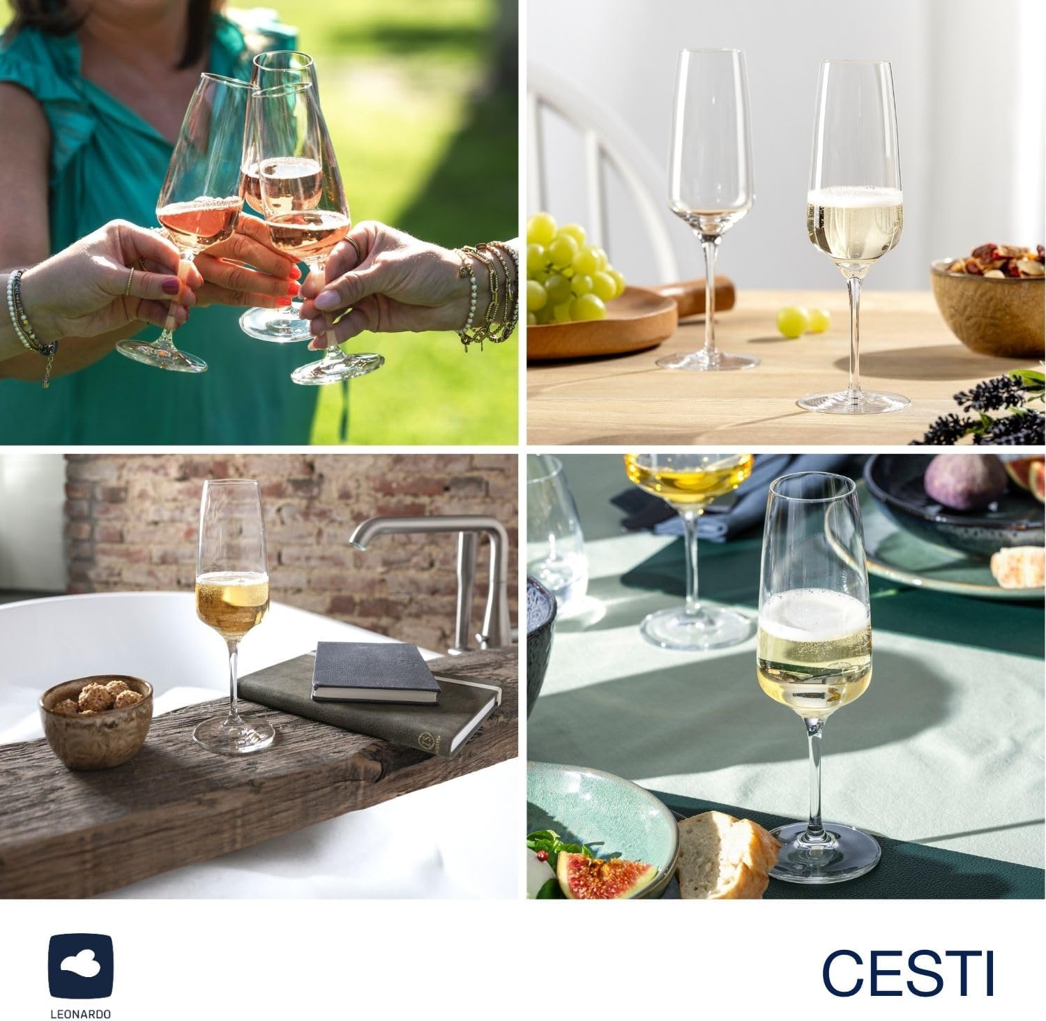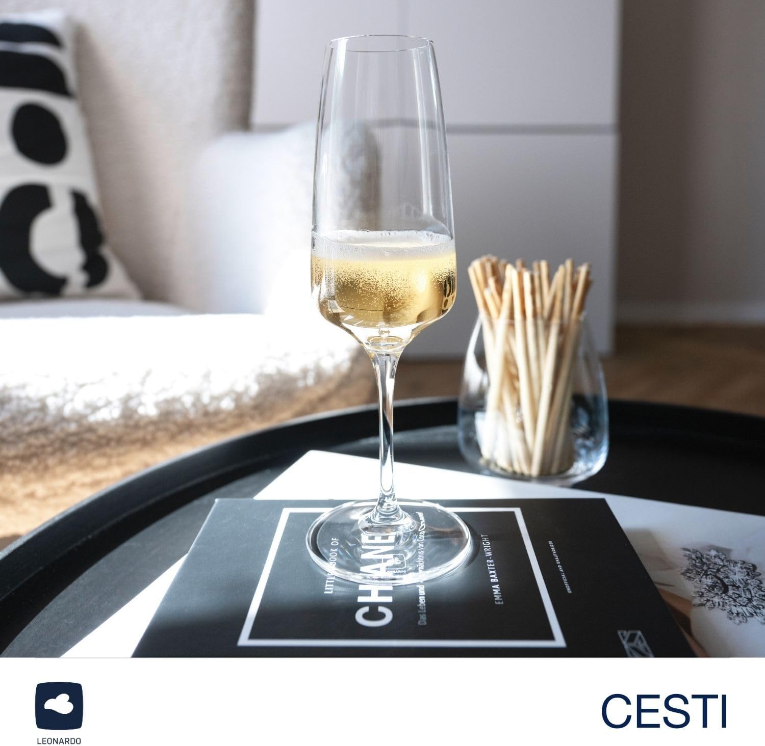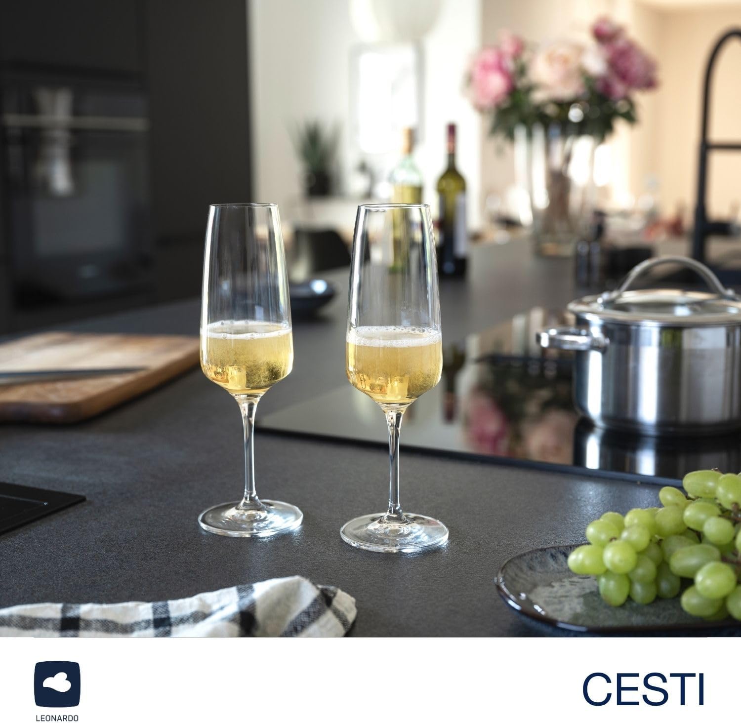 لیوانهای شامپاینی LEONARDO HOME مدل CESTI (مجموعه ۶ عددی) شامل پارچه جلادهنده • لیوانهای Prosecco قابل شستشو در ماشین ظرفشویی (۲۴۰ میلیلیتر) • مقاوم در برابر ضربه و مناسب برای استفاده روزمره • لیوانهای شراب گازدار با پایه کوتاه • لیوان شامپاینی Cesti • ۰۴۰۹۶۸ ۶ لیوان شامپاینی + پارچه جلادهنده