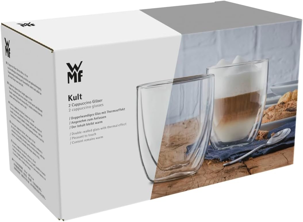 WMF Kult doppelwandige Cappuccino Gläser Set 2-teilig, doppelwandige Gläser 250ml, Schwebeeffekt, Thermogläser, hitzebeständiges Teeglas, Kaffeeglas 2 Stück (1er Pack) Single | قیمت یورویی 12.99€
