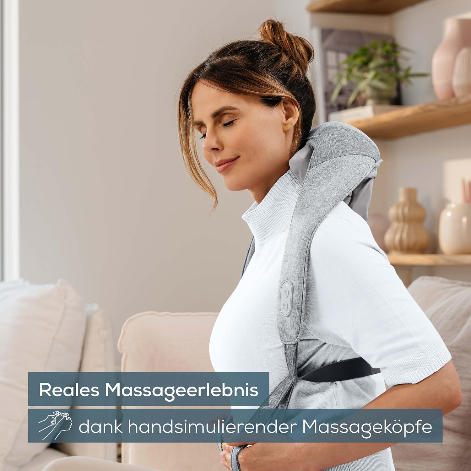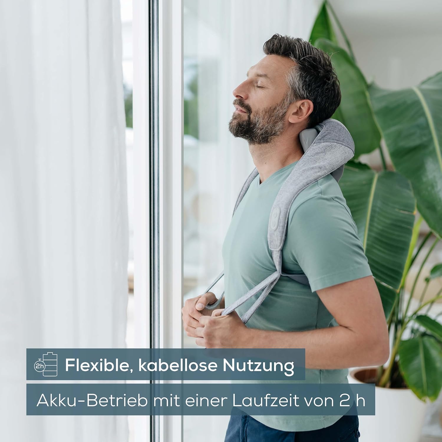 KABELLOSE ANWENDUNG: Für Flexibilität während der Anwendung besitzt das Nacken-Massagegerät einen leistungsstarken Lithium-Ionen-Akku, der eine kabellose Anwendung bis zu 2 Stunden ermöglicht REALES MASSAGE-ERLEBNIS: Die 4 Massageköpfe und 2 Massagefinger simulieren eine echte Wellness-Massage, die du mit dem Massagegerät jeden Abend bequem von der Couch aus genießen kannst ZUSCHALTBARE WÄRMEFUNKTION: Neben der Massage hast du die Möglichkeit, die optionale Wärmefunktion zu aktivieren, die die Durchblutung anregt und bei der Regeneration deiner Muskulatur unterstützt 2 INTENSITÄTSSTUFEN: Je nach Belieben und Verspannungsgrad kannst du zwischen 2 Intensitätsstufen wählen und den Druck zusätzlich mit 2 Schlaufen für die Hände verringern oder verstärken HANDS FREE SYSTEM: Das Massagegerät wird um den Nacken gelegt und kann mittels Schnalle hinter dem Rücken befestigt werden; so hast du während der Massage dennoch freie Hände für andere Erledigungen | قیمت یورویی : 92.99€