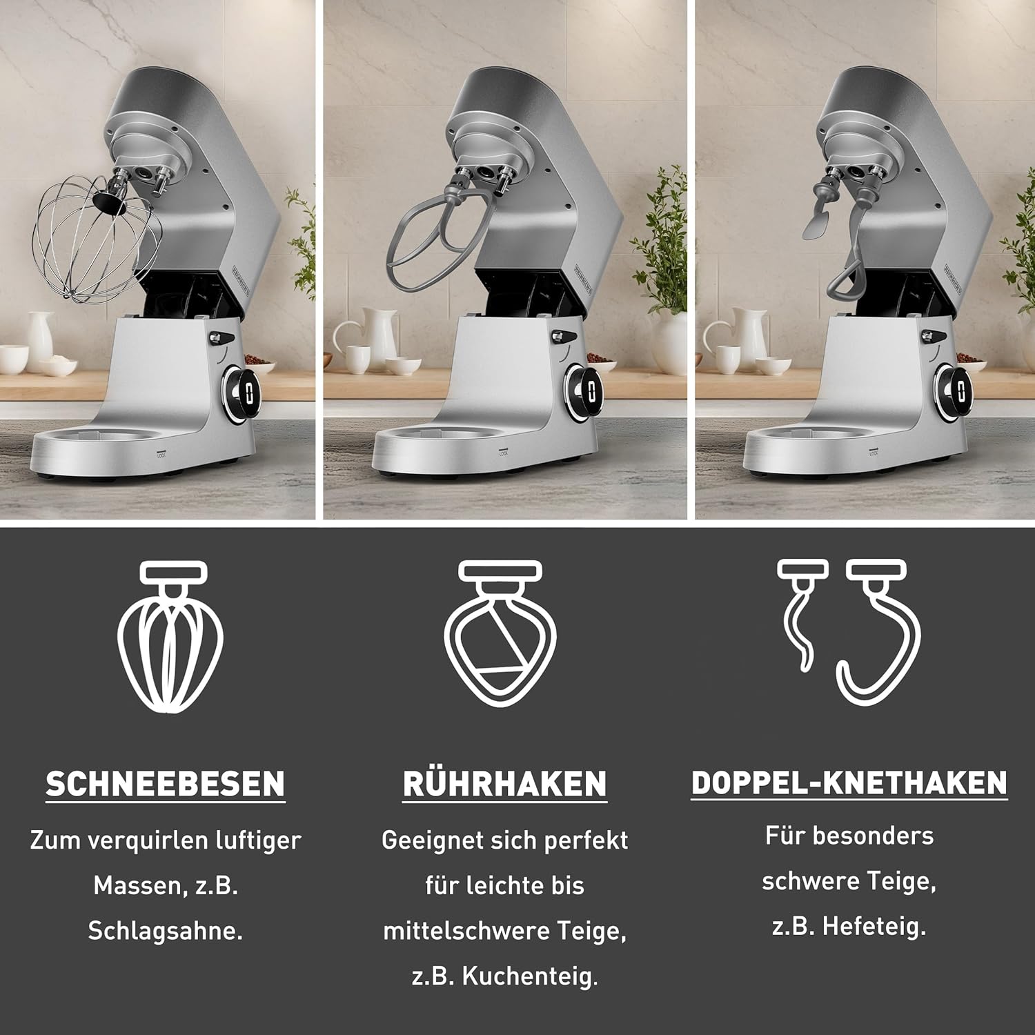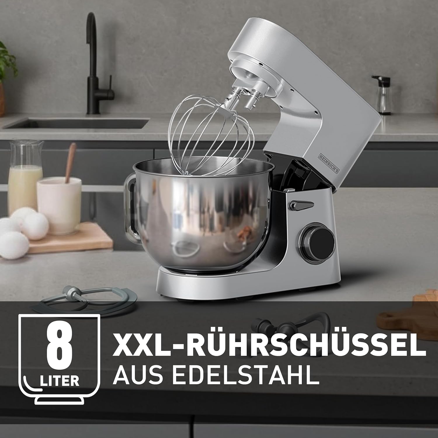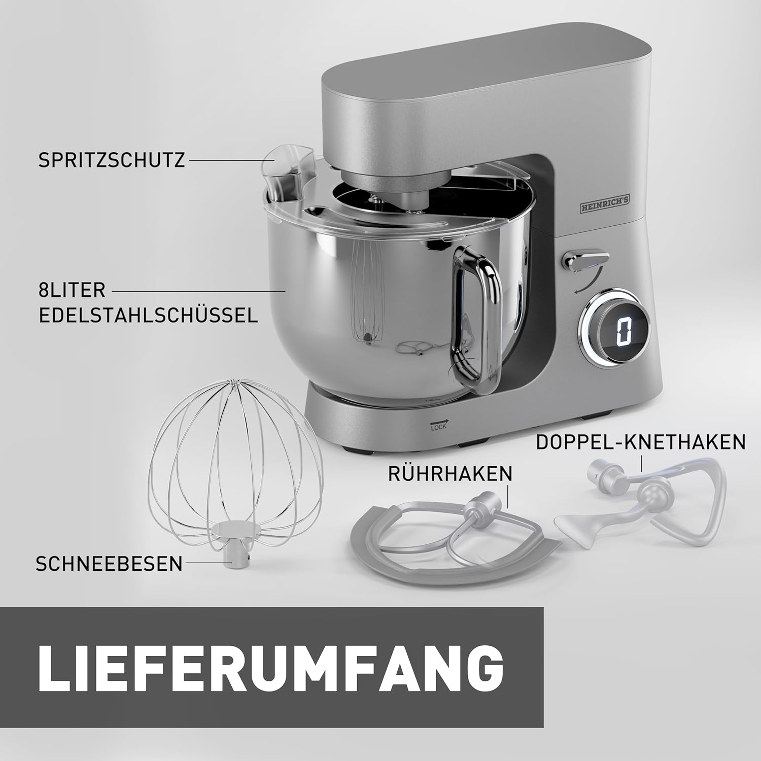 Heinrichs´s Küchenmaschine, Knetmaschine, Teigmaschine, 2500W Küchengerät, Doppel-Knethaken, Rührhaken, Schneebesen, 8 einstellbare Geschwindigkeiten, XXL 8L Edelstahlschüssel,geräuscharm, Sternsilber | قیمت یورویی 149.99€