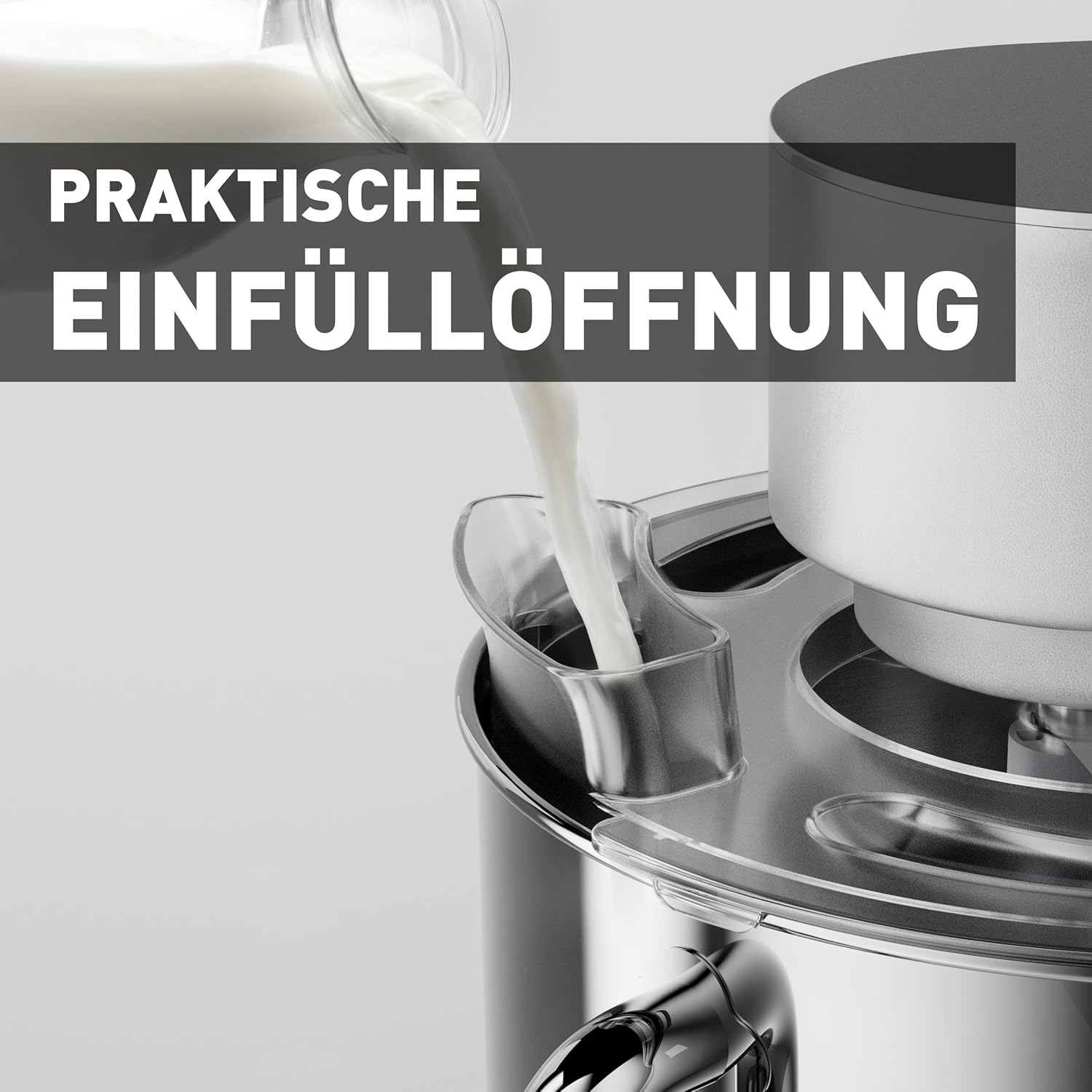 💪Leistungsstarker Motor: Mit 2500 Watt Leistung meistert die Heinrich´s Knetmaschine mühelos alle Aufgaben in der Küche. Die große Edelstahlschüssel mit 8,0 Litern Fassungsvermögen bietet genug Platz, um aller Art Teige, Cremes oder andere Zutaten in größeren Mengen zuzubereiten – perfekt für Familien und Backliebhaber! 🍰Vielseitige Anwendungen: Dank der beiden hochwertigen Teflonbeschichteten Aufsätzen (Doppel-Knethaken und Rührhaken mit Silikon-Lippe) und dem Schneebesen können Sie die Maschine flexibel für unterschiedliche Rezepte nutzen. Ob Brotteig, Kuchenteig oder Sahne, die Aufsätze lassen sich schnell und sicher mit dem Easy Click System wechseln, sodass diese im Handumdrehen einsatzbereit sind – passend für jedes Rezept! ✅Einfache und sichere Bedienung: Mit den 8 einstellbaren Geschwindigkeitsstufen können Sie die Zubereitung individuell anpassen. Die Lock/Unlock Funktion für den Schwenkarm sorgt für eine sichere Handhabung, während der Spritzschutzdeckel und die Anti-Rutschfüße für einen sauberen und standfesten Betrieb sorgen – so macht Backen noch mehr Spaß! 👍Leiser Betrieb und modernes Design: Trotz kraftvoller Leistung arbeitet die Maschine angenehm leise mit nur etwa 78 dB, sodass Sie in angenehmer Atmosphäre Backen können. Das schlanke, moderne Design passt perfekt in jede Küche und macht die Knetmaschine zu einem stilvollen Helfer im Alltag. Auch die integrierte LED-Beleuchtung, welche im Hintergrund des Drehreglers in weiß erleuchtet, ist ein absoluter Hingucker. 🎁Freude beim Verschenken: Überraschen Sie Ihre Liebsten mit unseren Produkten. Wir stehen Ihnen auch dort mit Rat und Tat zur Seite. | قیمت یورویی : 149.99€