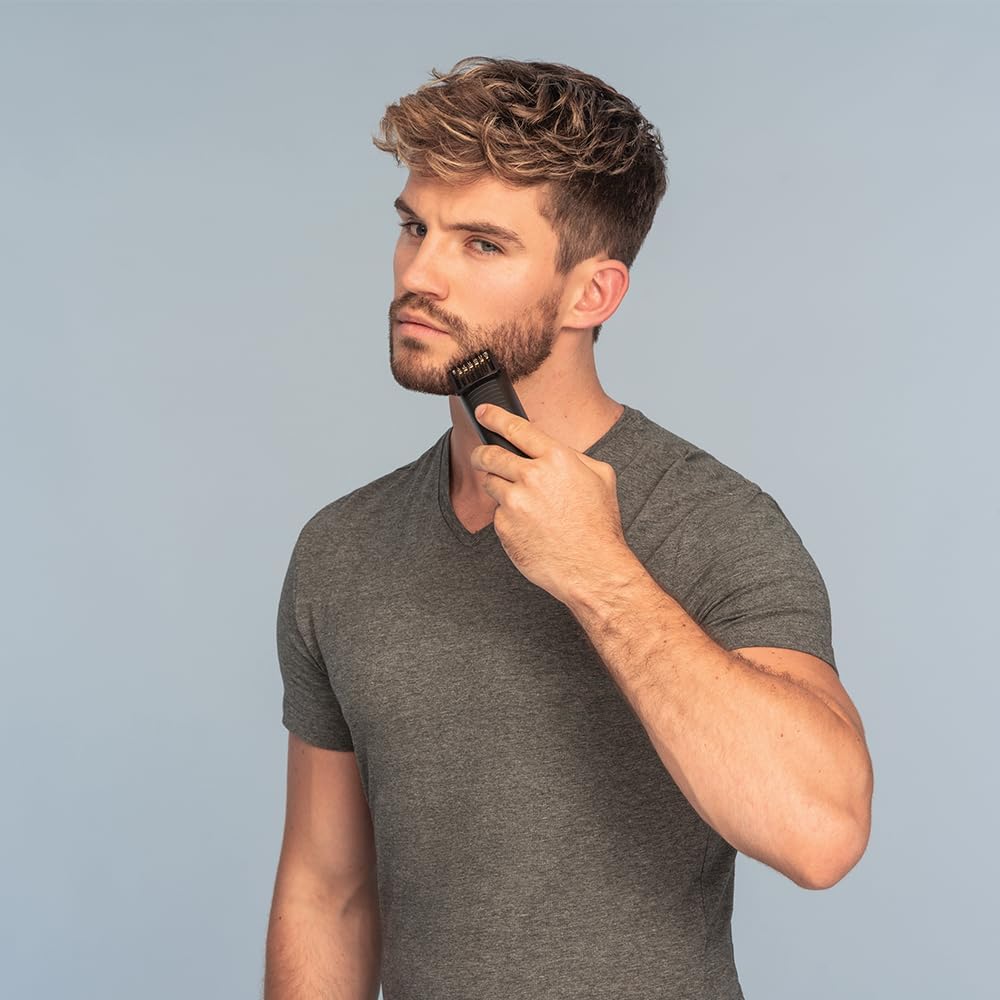 LÄNGENEINSTELLUNGEN (0,4-18mm) - Ultimative Präzision und absolute Kontrolle dank der 17 Schnittlängeneinstellungen und einen verstellbaren Aufsteckkamm. Perfekt für Stoppeln, kurze oder Vollbärte in 0,5-mm- bis 2-mm-Schritten TITANBESCHICHTETE, SELBSTSCHÄRFENDE KLINGEN – Hochwertige, titanbeschichtete Klingen schärfen sich selbst und sorgen so jedes Mal für einen sauberen, glatten Schnitt. Ideal für die regelmäßige Bartpflege ZOOM-RAD FÜR EINFACHE EINSTELLUNG – Das intuitive Zoomrad macht das Einstellen der verschiedenen Längen zum Kinderspiel und im Handumdrehen kann ein präziser und gleichmäßiger Bartschnitt erzielt werden. Pflege den Bart mit gleichbleibenden Ergebnissen und voller Kontrolle NETZ-/AKKUBETRIEB + 60 min. BETRIEBSZEIT - Kabellos bis zu 60 Minuten Laufzeit oder mit Netzstecker für Dauerbetrieb. Vollständige Aufladung in 2 Stunden. Ideal für die Bartpflege zu Hause oder unterwegs "LEICHT ZU REINIGENDES DESIGN + AUFBEWAHRUNGSTASCHE - Abnehmbare, waschbare Klingen sorgen für eine einfache Reinigung und Hygiene. Die praktischen Reisetasche sorgt für sichere und , kompakte Aufbewahrung – ideal für Urlaubsreisen und den täglichen Gebrauch. " | قیمت یورویی : 24.99€
