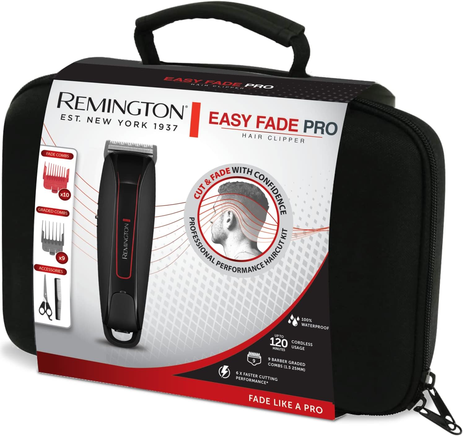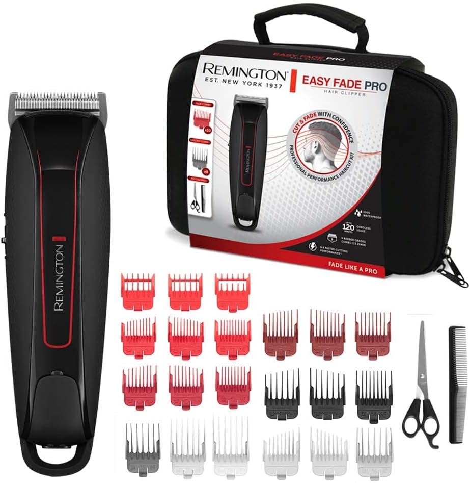 Remington Haarschneidemaschine Profi [selbstschärf. Edelstahl Klingen/10 angeschrägte Fade-Kämme/0,8-25mm] Haarschneider Set (inkl. 9 normale Aufsteckkämme, Netz-/Akkubetrieb, Lithium, Tasche) HC550 | قیمت یورویی 62.65€
